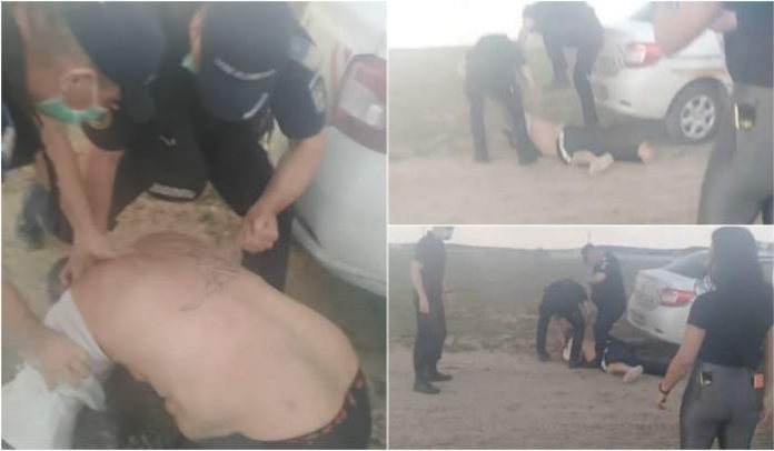 Un căruțaș întins pe jos a fost bătut de polițiști și jandarmi, la Mihail Kogălniceanu, în Tulcea. „Îl băgați în portbagaj?”, întreabă o femeie care a fost martoră și a fost și ea imobilizată pe pământ.