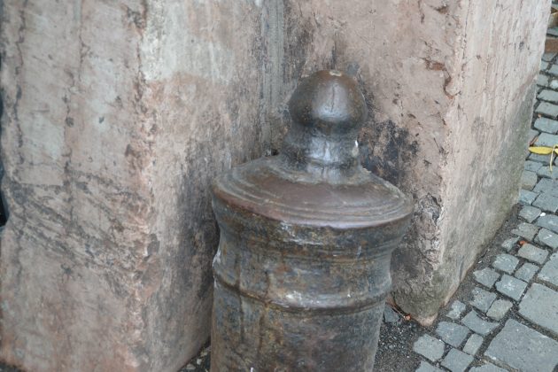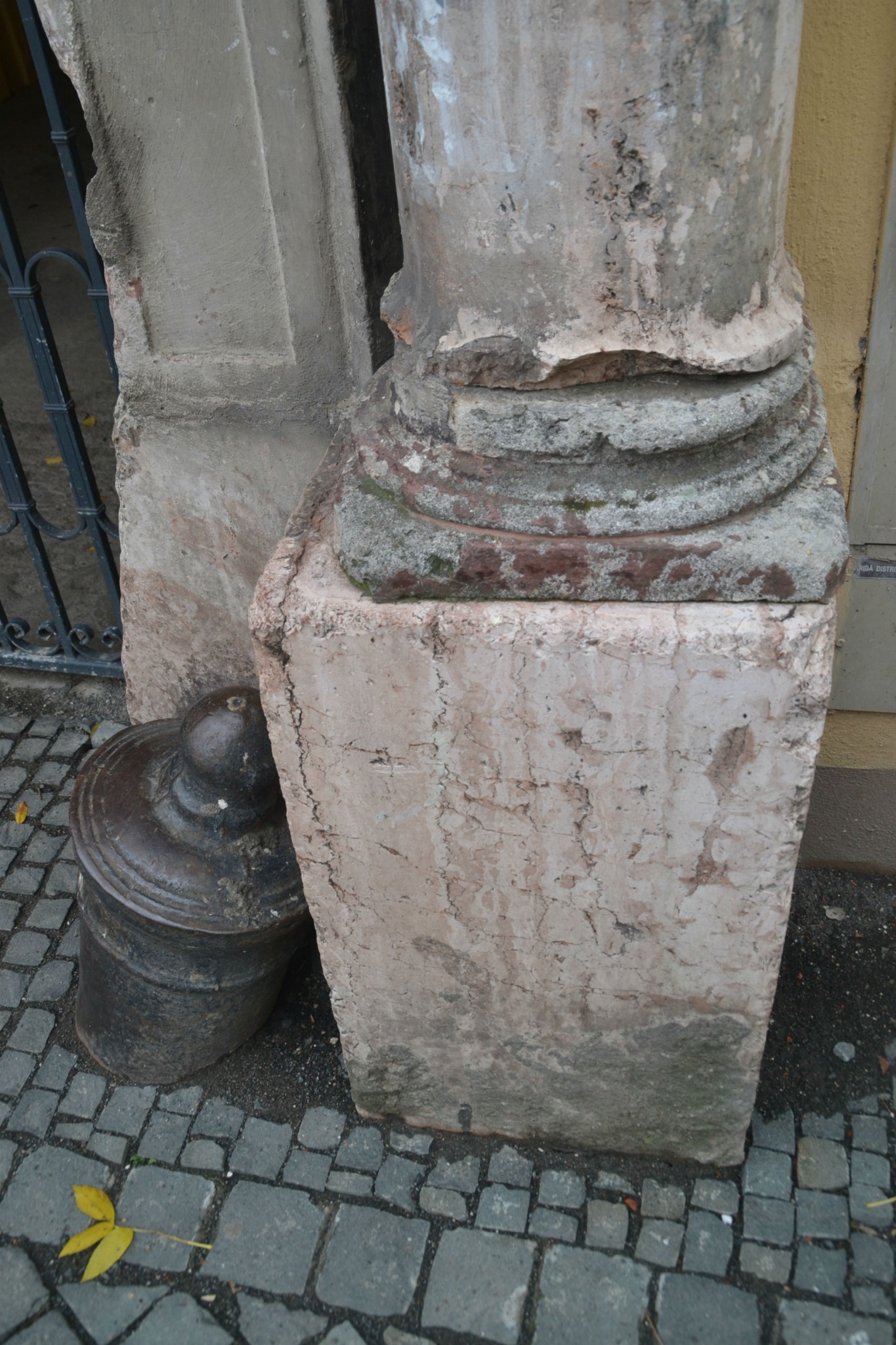Tot un element inedit sunt și cei doi stâlpi ce străjuiesc poarta. Era o practică a acelor ani ca, de o parte și alta a unei intrări mai mari, să fie montați stâlpi de protecție. Aceștia aveau rolul de a proteja zidul și poarta, când erau lovite de osiile căruțelor și ale caleștilor. De obicei, erau dăltuiți din piatră masivă, dar, mai târziu, au fost confecționați din fier masiv. Și aici constructorul a ales o variantă deosebită. Se văd două tunuri turcești de mare calibru, care sunt îngropate, mai mult de două treimi, la marginea porții. Acesta era un mod de a spune tuturor că a apus puterea otomană. Vechile tunuri erau numai bune ca stâlpi. După cucerirea habsburgică au fost păstrate o bună parte din tunurile capturate, foarte performante în epocă. Se cunoaște supremația artileriei turcești în secolele XVI și XVII. Tunurile au fost folosite în continuare și de învingători. Din cele 260 de asemenea piese de artilerie ale cetăţii, doar 120 aveau pe ele pajura austriacă, restul provenind din arsenalul otoman. Cu timpul, acestea au fost scoase din uz şi folosite, după moda vremii, ca „martori” la casele mari. Tot sub vechea poartă s-a păstrat, până pe la finalul anilor 1990, vechiul paviment din butuci de lemn, care, de-a lungul secolelor, a prins o patină superbă. Lemnele arătau ca fiind atât de lustruite, de parcă erau pietrificate. Din păcate, o minte isteață a crezut că poate să le arunce la gunoi; stejarul lor, fiind considerat desuet, a fost înlocuit cu banalul beton al zilelor noastre.