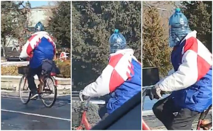 Casca de criză a unui biciclist din Reşiţa a stârnit hohote de râs în trafic, şoferii filmându-l uluiţi pe reşiţeanul care a găsit o metodă inedită pentru a se feri de frigul năprasnic.