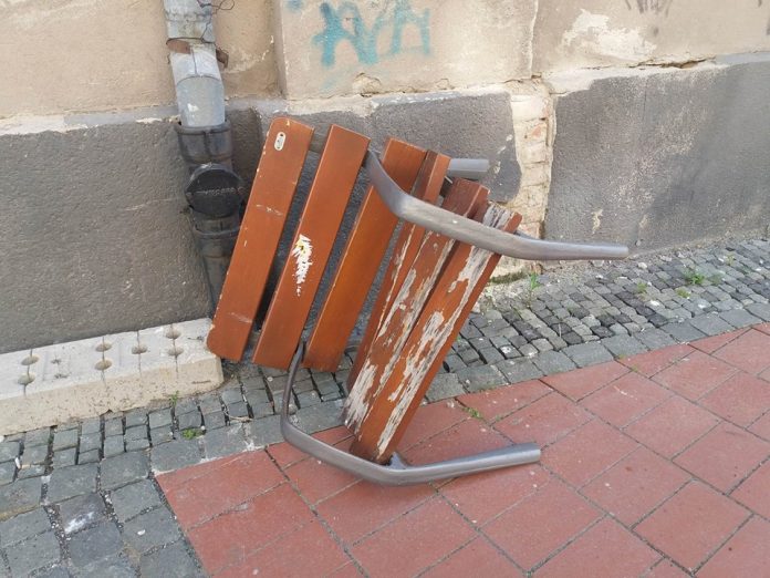 Pe strada E. Ungureanu duminică de dimineață zace un biet scaun stradal extrem de greu și din materiale solide. Nici o șansă să scape. Dobitocul ce a avut treabă cu mobilierul din piața Libertății a muncit până l-a cărat la loc ascuns. Iar acolo, mai departe de privirile trecătorilor, a reușit să îndoaie picioarele masive din fontă turnată și să rupă scândura groasă din esență tare de fag. În mod normal dacă un elefant de circ s-ar fi urcat pe acel scaun nu ar fi putut să-l vatăme. Dar animalul biped a reușit. Probabil a muncit mult. Dar pentru el a meritat. A devenit vedetă între cei de teapa lui. A muncit o oră să distrugă un scaun dar este răsplătit de o glorie de cîteva minute.