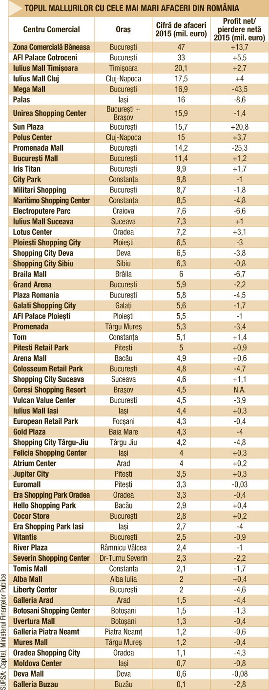Primele trei poziţii din ierarhia mallurilor cu cele mai mari afaceri în 2015 sunt neschimbate faţă de anul anterior. Zona Comercială Băneasa este urmată în clasament de AFI Palace Cotroceni, care a avut anul trecut venituri din chirii de 33 mil. euro. Iulius Mall Timişoara, cu 20,1 mil. euro, ocupă locul trei, urmat de mall din Cluj-Napoca al lui Iulian Dascălu, cu venituri de 17,5 mil. euro. Iulius Mall Cluj a preluat locul mallurilor Unirea Shopping Center din Bucureşti şi Braşov, care anul trecut au căzut pe poziţia a şaptea.