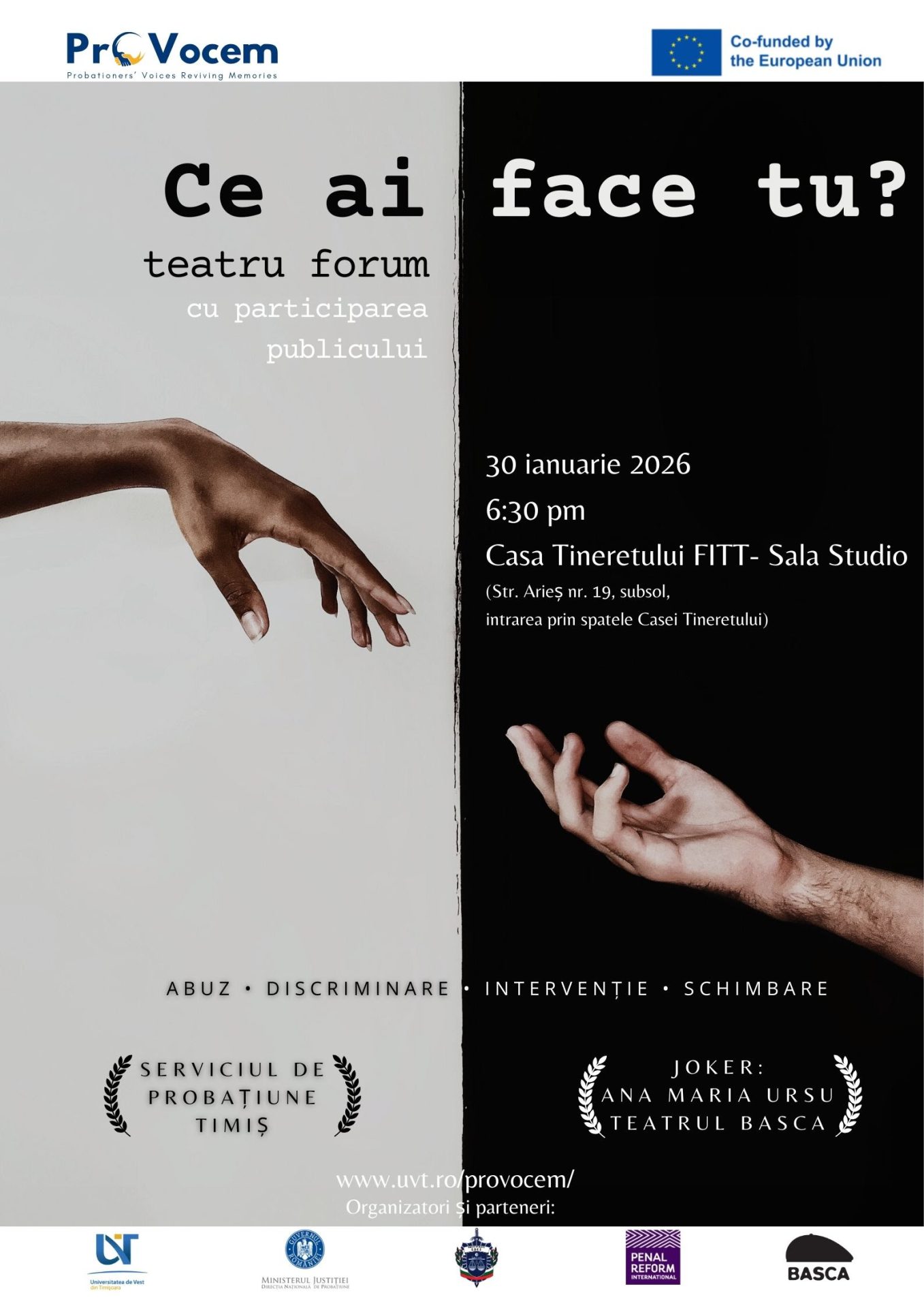 Universitatea de Vest din Timișoara (UVT) împreună cu Direcția Națională de Probațiune – Serviciul de Probațiune Timiș au organizat vineri, 30 ianuarie 2026, spectacolul de Teatru Forum intitulat „Ce ai face tu?”, la sala Studio a Fundației Județene pentru Tineret Timiș (FITT). Evenimentul a adus în prim-plan implicarea activă a publicului în explorarea unor situații reale și provocări sociale contemporane, în cadrul proiectului european „Probationers’ Voices Reviving Memories – PRO-VOCEM”, (ProVocem – Vocile din Probațiune care Reînvie Amintiri), finanțat de către European Education and Culture Executive Agency (EACEA), CERV-2024-CITIZENSREM.