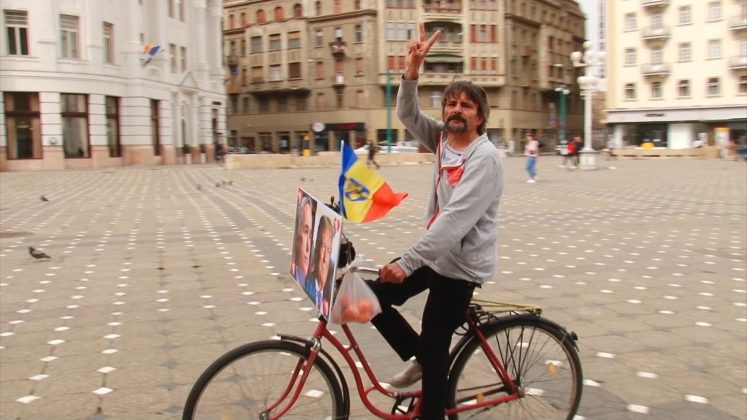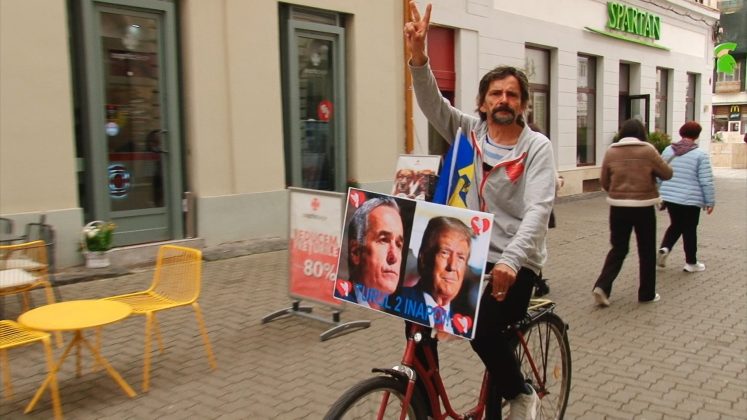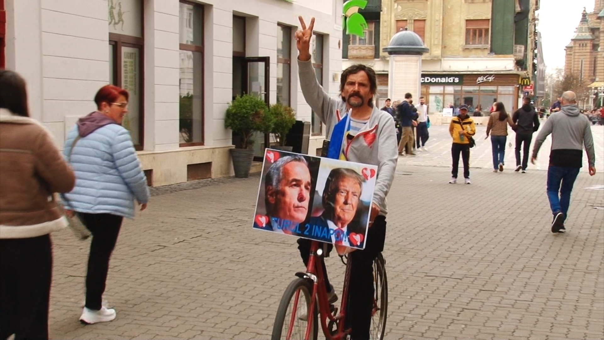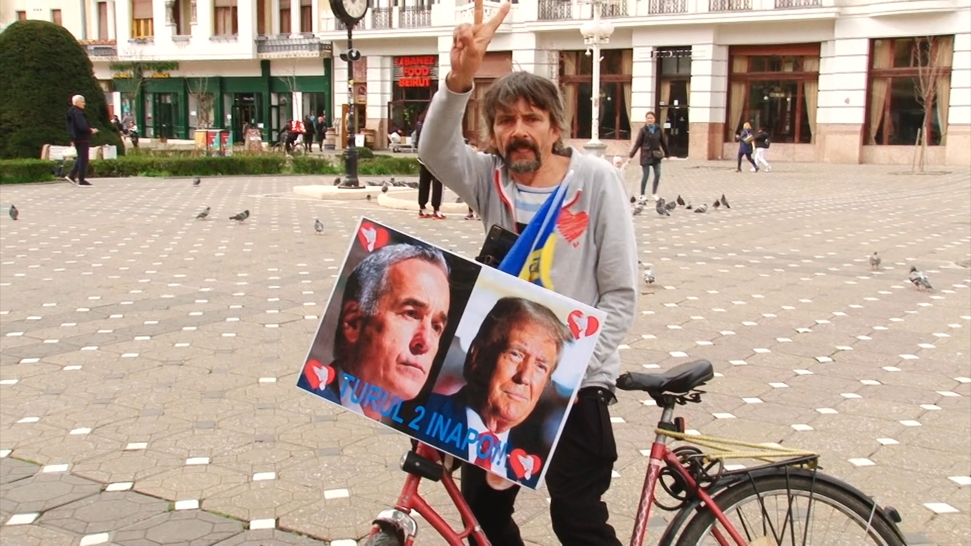 Am dat și peste un fan împătimit al fostului candidat Călin Georgescu care striga de pe o bicicletă „Turul doi, înapoi”, acompaniat de o muzică veselă de la boxa personală și de o pancardă cu portretul lui Donald Trump și, bineînțeles, înjumătățită de chipul lui Călin Georgescu. Semn că este revoltat de respingerea acestuia de la alegerile prezidențiale.