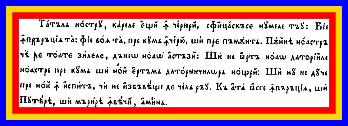 Transliterare: „Tatăl nostru, carele ’ești în ceriuri, sfințascăse numele tău: Vie înpărățiia ta: Fie voia ta, pre cum în ceriu, și pre pământ. Pâinea noastră cea de toate zilele, dăneo noao astăzi: Și ne iartă noao datoriile noastre pre cum și noi ’ertăm datornicilor noștri: Și nu ne duce pre noi în ispită, ci ne izbăveaște de cel rău. Că a ta iaste înpărățiia, și Putearea, și mărirea în veaci, amin.”