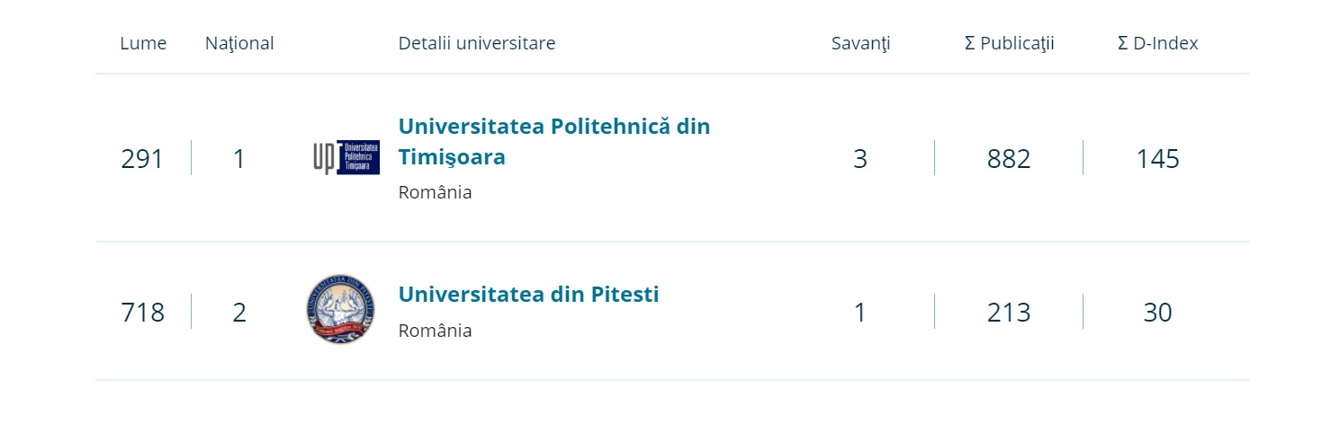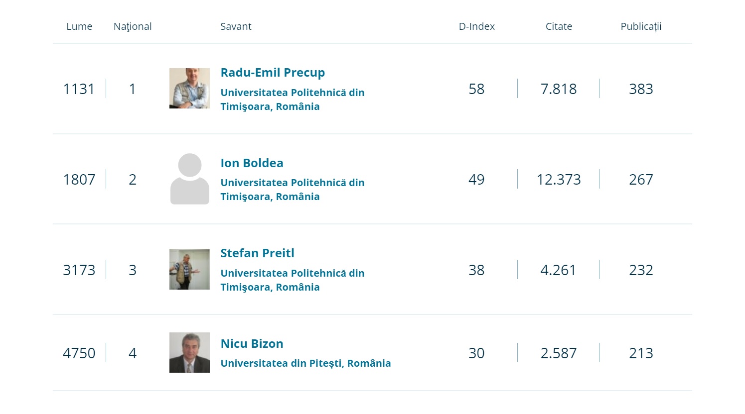 Poziția în clasament se bazează pe o sumă a indicelui D (indicele H de disciplină) al tuturor oamenilor de știință de seamă afiliați la acea universitate. Instituția timișoreană de învățământ superior, cu o tradiție de peste 100 de ani, este prezentă în top cu 3 profesori – Radu-Emil Precup, Ion Boldea și Ștefan Preitl – care ocupă și primele trei poziții în clasamentul național.