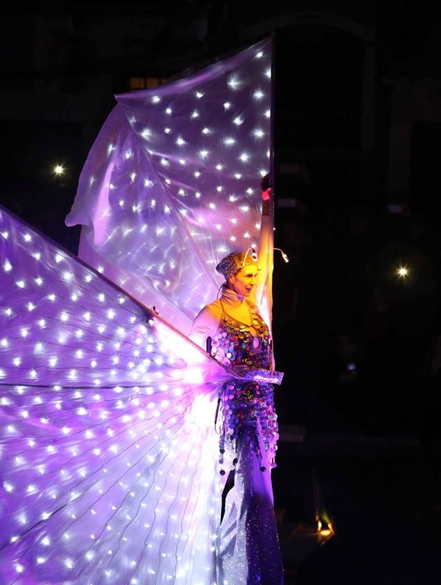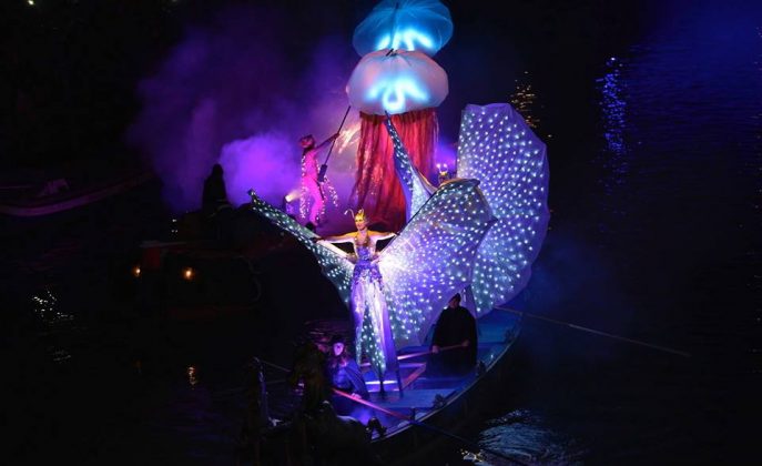 Participanții au putut admira femei în costume cu uriașe aripi albastre, defilând la căderea nopții în bărci venețiene sau personaje de poveste, care păreau suspendate în aer.