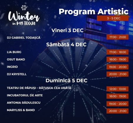 Duminică, cei mici sunt invitaţi la teatru de păpuşi, de la ora 12:00, dar şi la momentele muzicale şi de dans care vor urma, cu şi pentru copii. Iar personaje de poveste, precum spiriduși, Crăiasa Zăpezii, Omul de Zăpadă, Crăciunița și Mascota Iulius Town, sunt nerăbdătoare să îi întâlnească şi să se distreze cu cei mici.