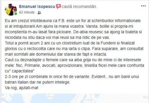 Emanuel Isopescu a făcut un anunț disperat pe care l-a distribuit amicilor săi. „Eu am crezut întotdeauna că F.B. este un for al schimburilor informaționale și al întrajutorării. Am ajuns la mâna voastră. Vârstă, bolile și propria-mi inconștienta m-au lăsat fără picioare.”, a scris Isopescu.
