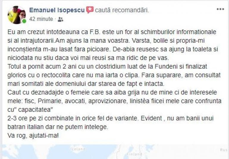 „Caut cu deznădejde o femeie care sa aibă grijă nu de mine ci de interesele mele: fisc, Primărie, avocați, aprovizionare, liniștea fiicei mele care confruntă cu” capacitatea” 2-3 ore pe zi combinate în orice fel de variante. Evident , nu am banii unui batran italian dar ne putem întelege. Vă rog, ajutati-mă!”, a încheiat Emanuel Isopescu.