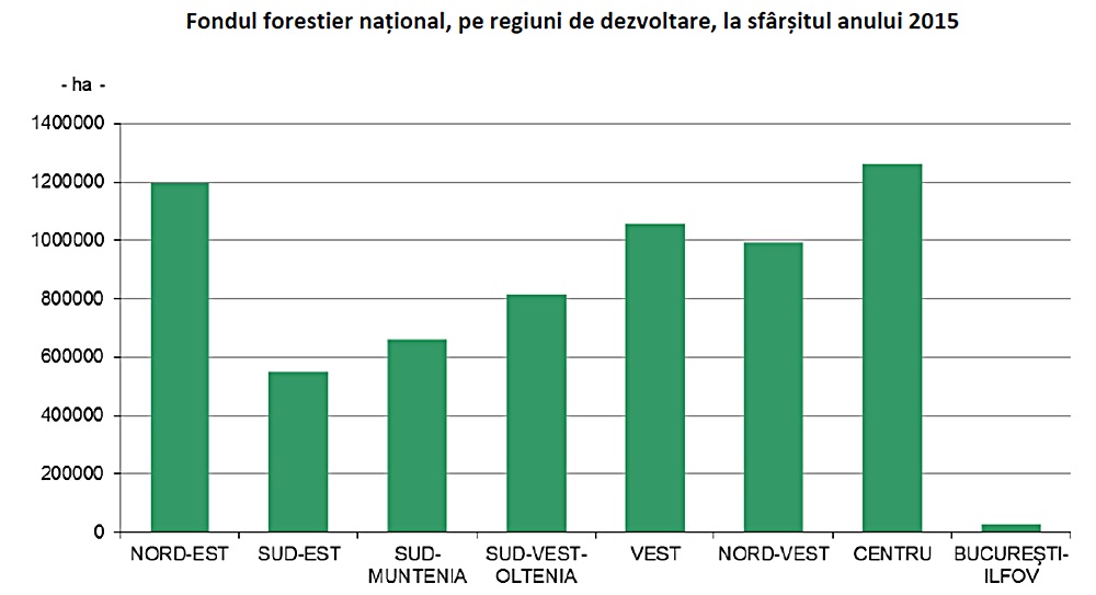 Fondul forestier național, la sfârşitul anului 2014, era de 6.544.588 ha, față de 6.555.122 ha la sfârșitul lui 2015.