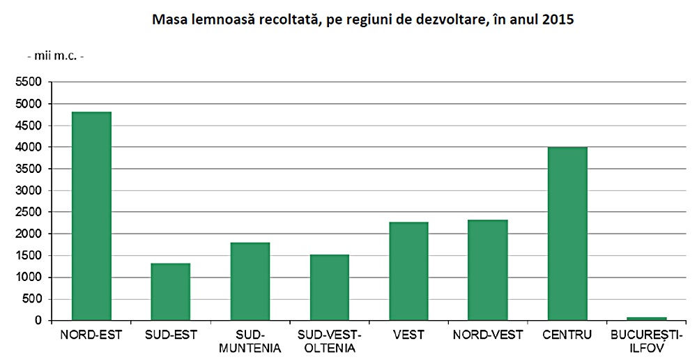 Cel mai mare volum de masă lemnoasă s-a recoltat în regiunea de dezvoltare NORD-EST (26,5% din totalul volumului de masă lemnoasă recoltată), urmată de regiunea de dezvoltare CENTRU (22,0%) şi într-o proporţie mai mică de regiunile de dezvoltare NORD-VEST (12,8%), VEST (12,6%), SUD-MUNTENIA (10,0%), SUD-VEST OLTENIA (8,4%), SUD-EST (7,3%) şi BUCUREŞTI-ILFOV (0,4%).