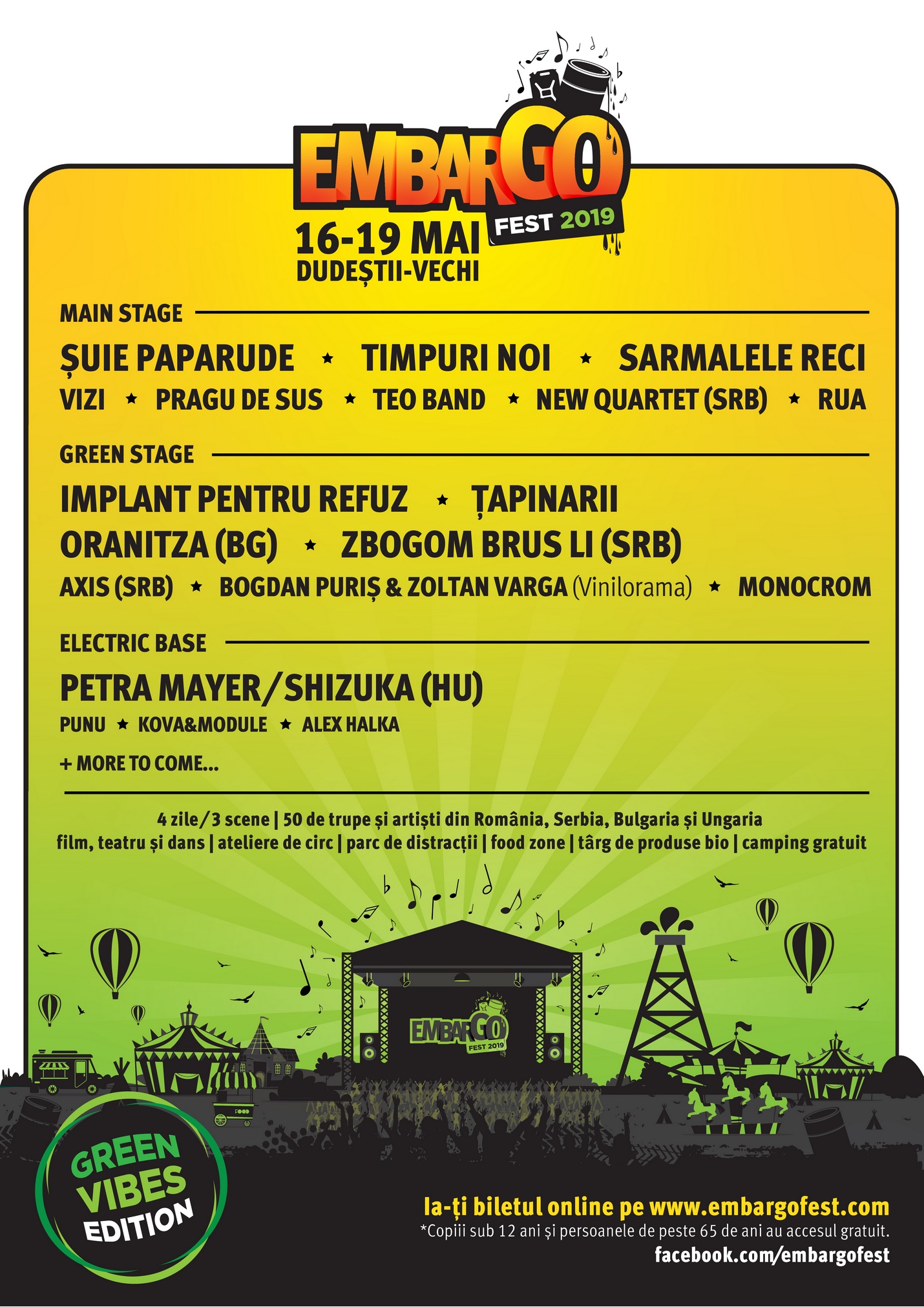 Pe scena principală de la Embargo Fest vor mai evolua Vizi, Pragu’ de Sus, Teo Band, New Quartet (Serbia), R.U.A. și alții. O altă scenă este Green Stage, cu ajutorul căreia organizatorii şi-au propus să promoveze muzica drept o puternică unealtă pentru un viitor mai verde. Acesta este şi motivul pentru care ediţia de anul acesta a Embargo Fest se va desfăşura sub umbrela de Green Vibes.