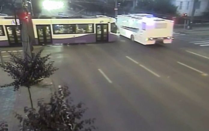 Un tramvai Armonia şi o dubă în care erau transportaţi 13 deţinuţi s-au lovit, aseară, în Timişoara. Accidentul a fost surprins de camerele de supraveghere din zonă.