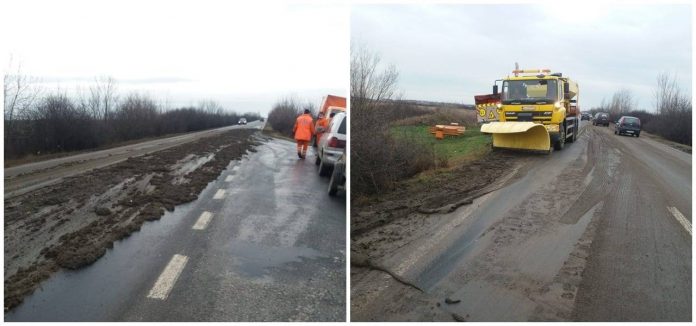 Asta a făcut ca circulația să se desfășoare foarte greu. „Circulație îngreunată pe DN 59A, în apropiere de Beregsău Mare (TM). Drumarii de la SDN Timișoara intervin pentru curățarea carosabilului, după ce persoane rămase neidentificate au pierdut… gunoiul de grajd pe drum”, a transmis DRDP Timișoara.