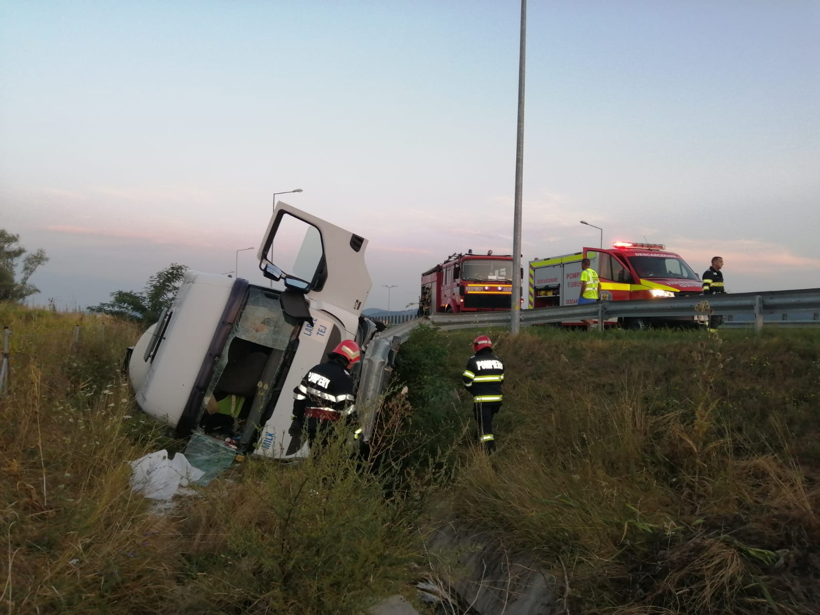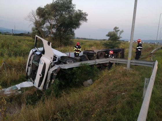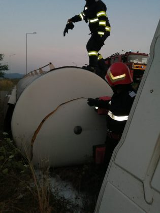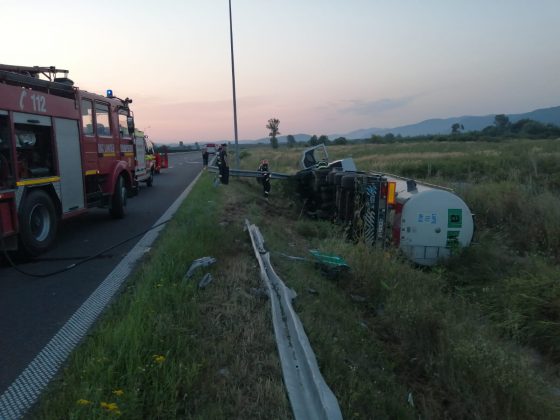 O cisternă care transporta 20.000 de litri de lapte s-a răsturnat în afara carosabilului, pe autostrada A1, în zona localităţii Ilia, din judeţul Hunedoara. Şoferul a rămas încarcerat, dar a suferit doar răni minore. Cel mai probabil a adormit la volan.