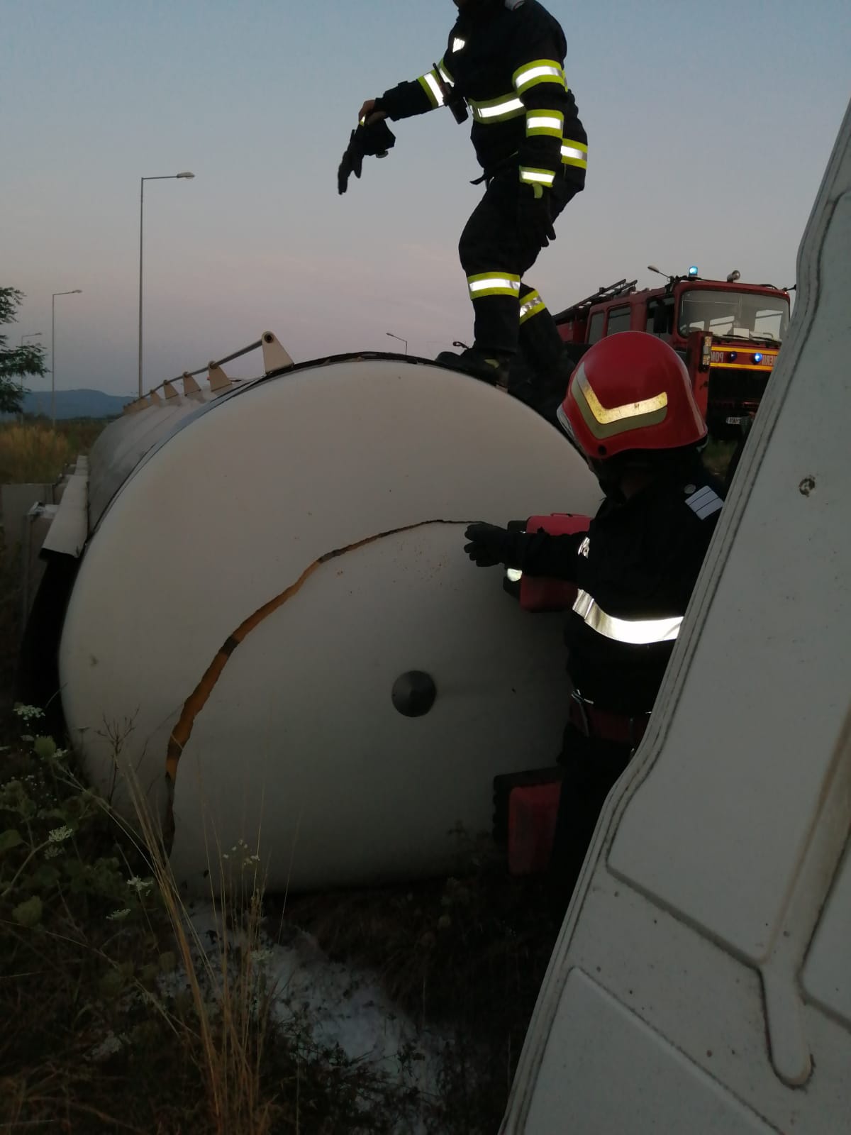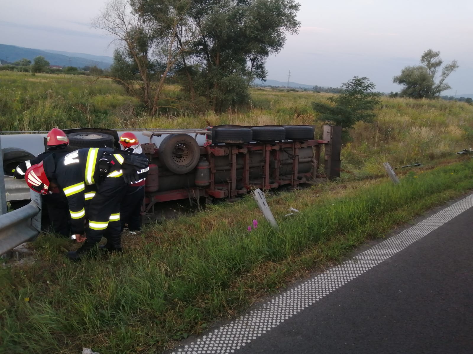 „Pompierii Secţiei Ilia specializaţi în descarcerare, stingere şi prim ajutor au ajuns în scurt timp la locul indicat prin 112 şi au găsit un bărbat încarcerat în cabina cisternei răsturnată în afara părţii carosabile. Şoferul a fost extras de echipaj, în stare conştientă şi cooperantă, fără leziuni vizibile. Bărbatul a fost preluat de echipa de prim ajutor, care a evaluat starea de sănătate şi a propus transportul la spital. Conducătorul auto a refuzat continuarea investigaţiilor medicale la Unitatea de Primiri Urgenţe. Concomitent echipajele de pompieri s-au asigurat că nu există pericolul izbucnirii unui incendiu la locul accidentului”, anunţă ISU Hunedoara.