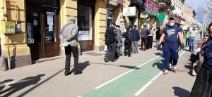 Doar la poarta de întrare în piață se vede că ceva este altfel decât în alte prilejuri. Oamenii de ordine lasă doar câțiva cumpărători să intre. Restul stau la coada destul de lungă dar la o distanță respectabilă de parcă ar fi certați unii cu alții. După ieșirea celor cu sacoșele pline mai sunt lăsați să intre iar câțiva doritori de marfă bună și frumoasă.