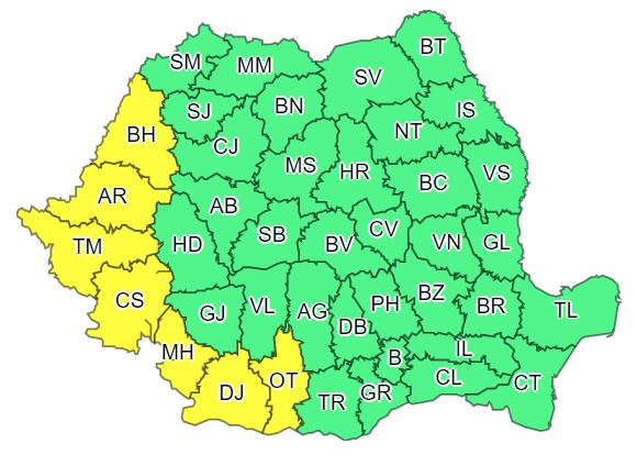 Administrația Națională de Meteorologie a emis un cod galben de caniculă, valabil luni, marți și miercuri în 7 județe, plus un alt cod galben de instabilitate temporar accentuată valabil luni pe circa jumătate din teritoriu.