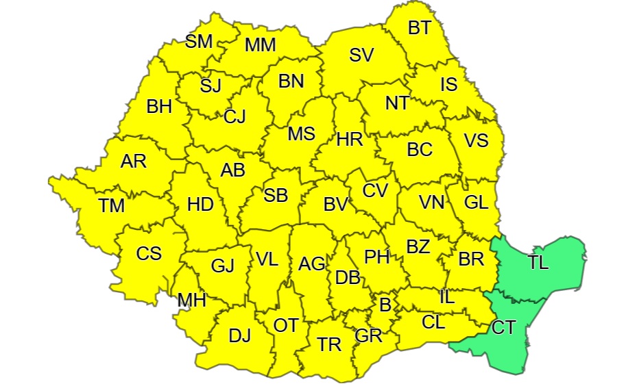 Meteorologii avertizează că până deseară la ora 23:00 vor fi perioade în care instabilitatea atmosferică va fi accentuată și se va manifesta prin averse torențiale, frecvente descărcări electrice, intensificări ale vântului, vijelii și grindină. Cantitățile de apă vor depăși 25 l/mp și izolat 40…50 l/mp.