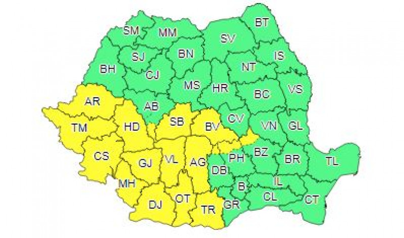 În vestul și sud-vestul teritoriului va ploua, iar în județele Arad, Timiș, Caraș-Severin și Mehedinți, ploile vor avea și caracter torențial și se vor acumula cantități de apă ce vor depăși local 25 l/mp și izolat 40 l/mp. În partea a doua a intervalului vântul se va intensifica și în centrul țării, unde rafalele vor fi în general între 50 și 60 km/h.