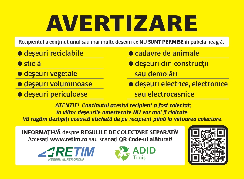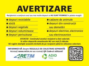 • ATENTIE! Autoritățile locale vor efectua controale și vor aplica amenzi conform legislației în vigoare, fiind sancționată necolectarea separată a deșeurilor.