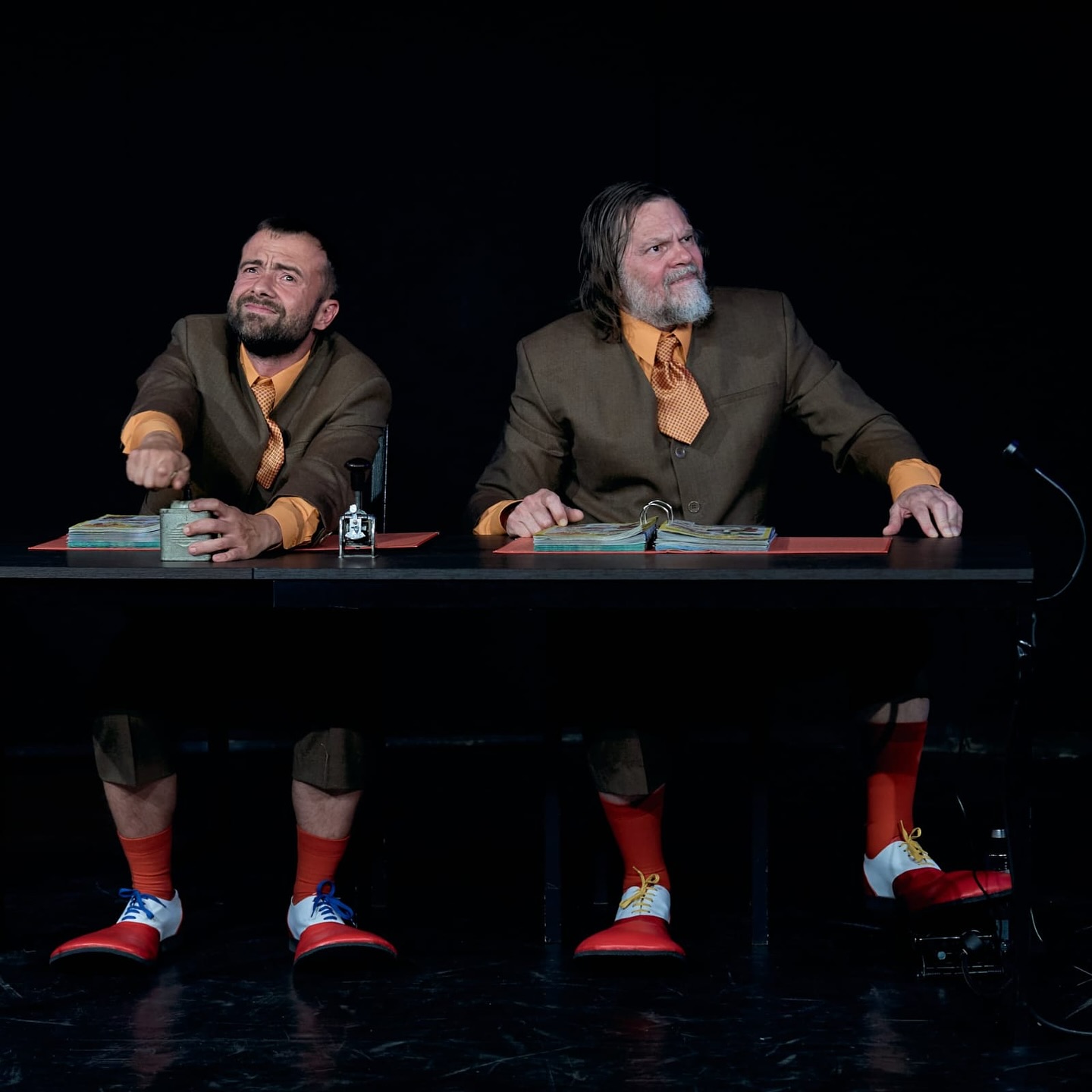 Spectacolul îi are în distribuție pe Florin Piersic Jr. și George Constantinescu, doi actori care transformă o poveste aparent simplă într-un duel scenic tensionat și captivant.