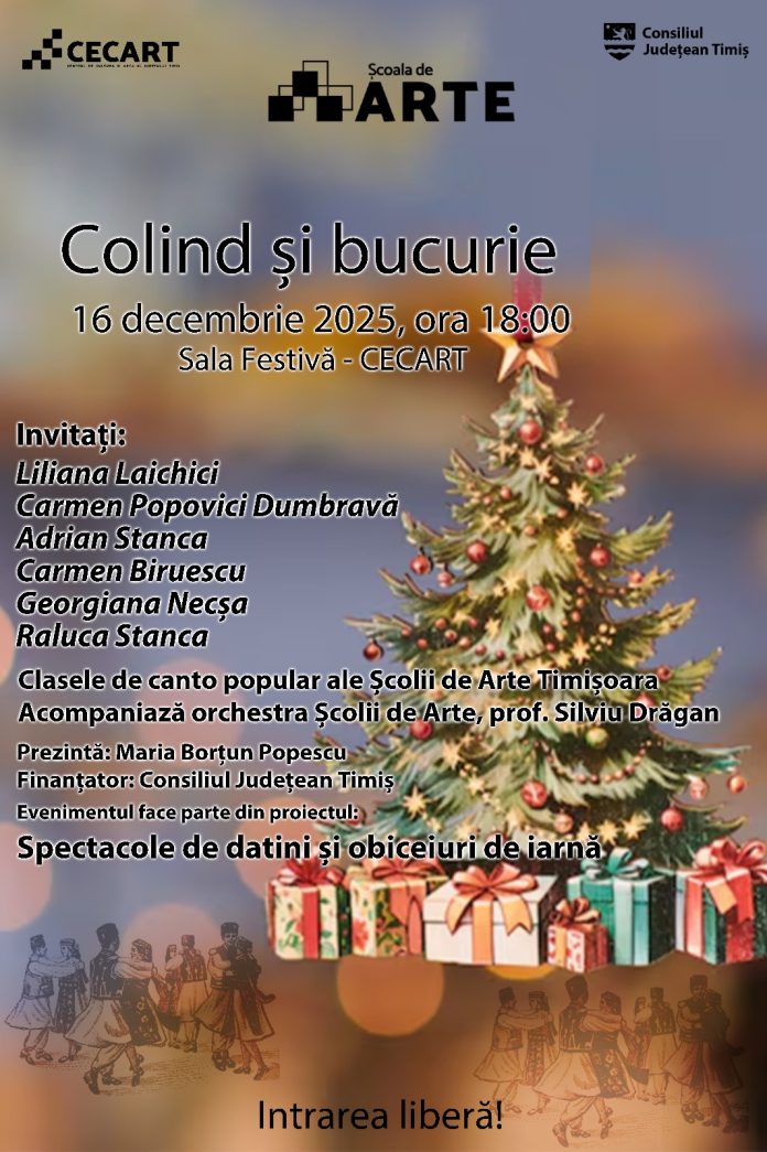Centrul de Cultură și Artă al Județului Timiș, instituție de cultură aflată în subordinea Consiliului Județean Timiș, invită iubitorii de tradiții la spectacolul „Colind și bucurie”, care va avea loc marți, 16 decembrie, de la ora 18:00, în sala festivă a Centrului de Cultură și Artă al Județului Timiș.