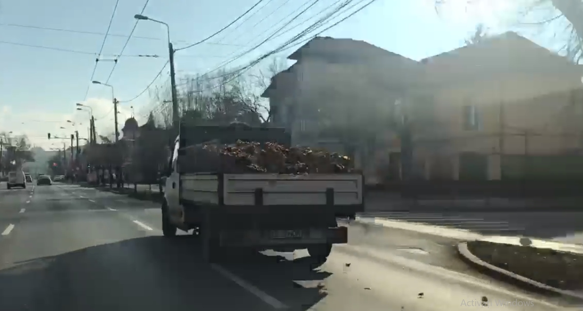 Video inedit filmat joi după masa, în Timișoara. Un șofer a întâlnit în drumul său o mașină a societății Horticultura încărcată cu frunzele adunate din parcuri. Doar că remorca nu avea trapă în spate, așa ca mare parte din frunzele transportate au ajuns… pe strada.
