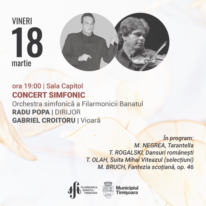 Vineri, 18 martie, de la ora 19, publicul meloman este așteptat la concertul susținut de orchestra simfonică a Filarmonicii Banatul, sub bagheta diriijorului Radu Popa, alături de violonistul Gabriel Croitoru.