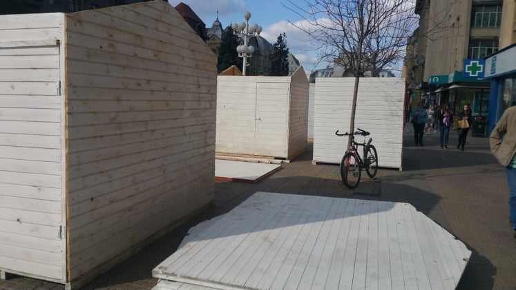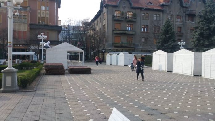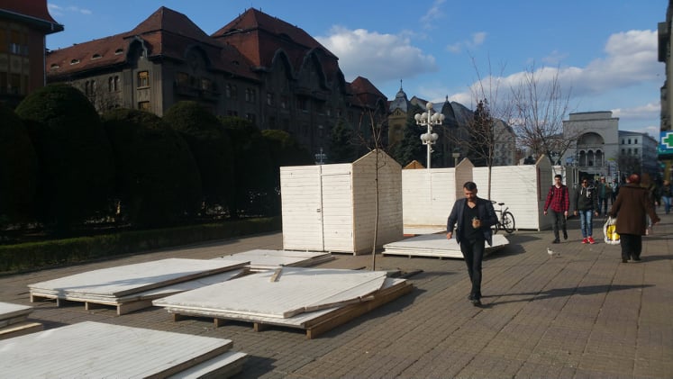 Au început pregătirile pentru Târgul de Paști din centrul Timișoarei. Muncitorii ridică de zor căsuțele albe care-i vor găzdui pe comercianți. De asemenea, se fac racordurile pentru utilitățile de care au nevoie participanții la târg.