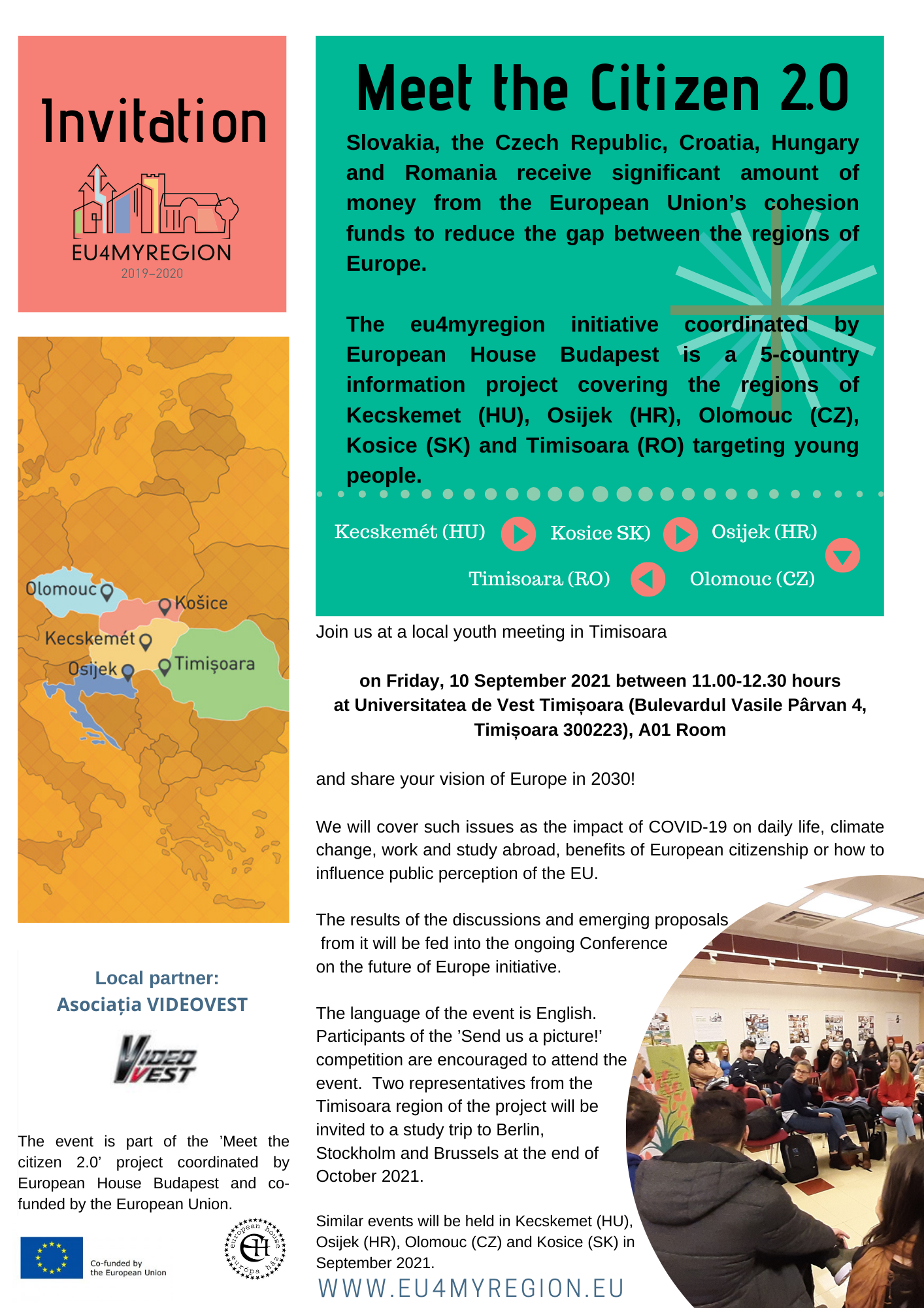 Un proiect euroregional incluzând cinci orașe Kecskemet (Ungaria), Osijek (Croația), Olomuc (Cehia), Kosice (Slovacia) și Timișoara (România), coordonat de European House Budapesta sub genericul Meet the citizen 2.0, îi informează pe tineri despre realizările cu fonduri europene din țările lor.