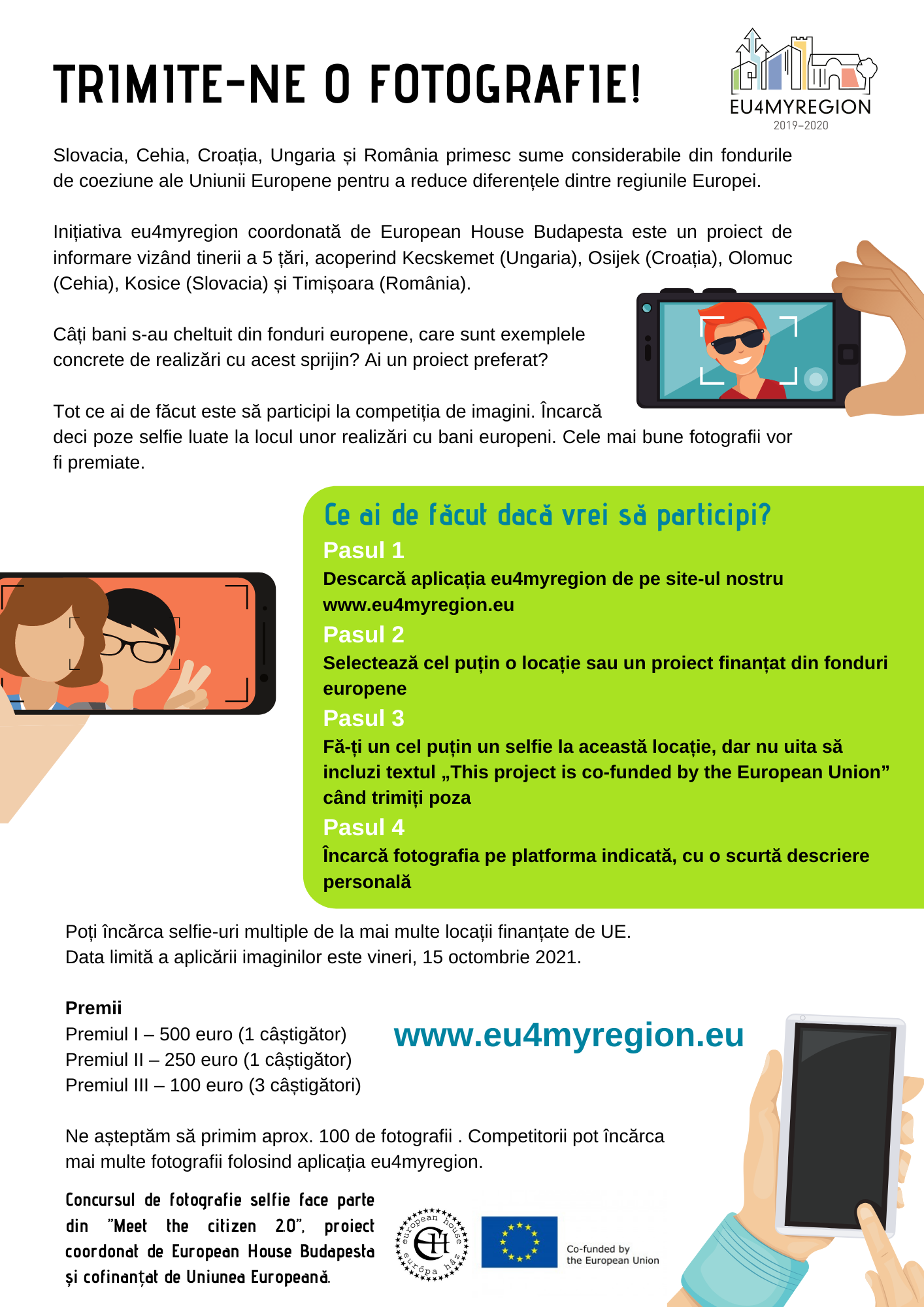 Dar cel mai atrăgător punct este concursul de selfie, imagini luate de la locul unor realizări cu bani europeni. Data limită a aplicării imaginilor este vineri, 15 octombrie 2021. Iată cum sună invitația: