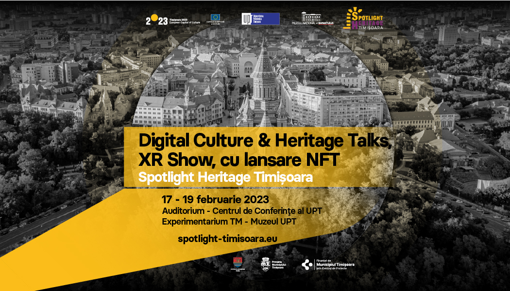Conferința hibridă „Cultură și Patrimoniu Digital și XR Show cu lansare NFT Spotlight Heritage Timișoara” aduce o categorie diversă de vorbitori internaționali, din zona de patrimoniu și cultură digitală și parțial din universitățile partenere E³UDRES², cu o serie de perspective culturale, educaționale, artistice și științifice, și, în premieră în peisajul românesc, lansarea NFT-ului (Non-Fungible Tokens) I Spotlight Heritage-Timisoara2023.