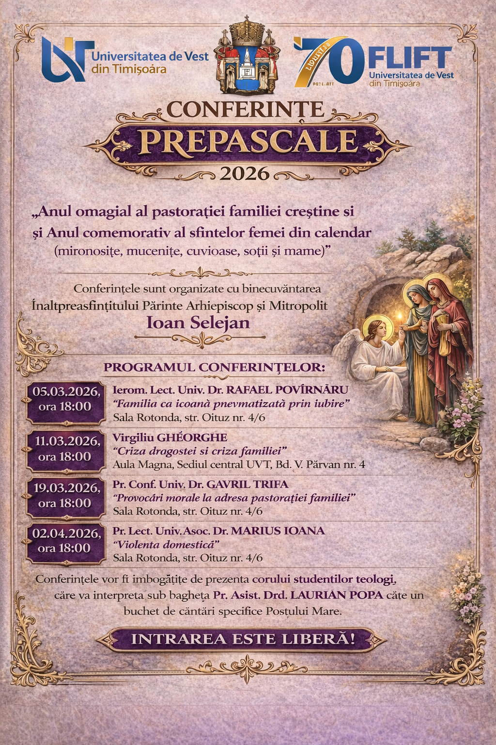 Conferințele reunesc invitați de marcă din mediul teologic și social și se desfășoară în perioada 5 martie-2 aprilie 2026, abordând teme actuale și importante pentru înțelegerea provocărilor familiei creștine contemporane, în acord cu „Anul omagial al pastorației familiei creștine” și „Anul comemorativ al sfintelor femei din calendar”, stabilite de Patriarhia Română.