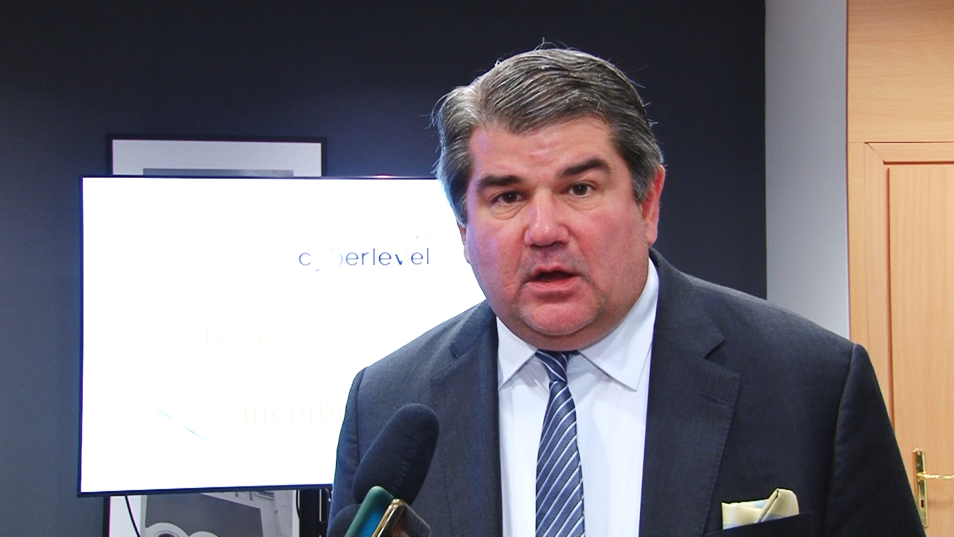 „Sunt onorat să fiu azi în Timișoara pentru a avea o prezentare la Camera de Comerț, Industrie și Agricultură Timiș. Sunt un cetățean american și sunt unul din proprietarii unei o companie de securitate cibernetică (se numește CYBER LEVEL INC). Noi avem un parteneriat între compania noastră și Camera de Comerț și Industrie a României. Lucrăm cu companiile românești membre ale Camerei de Comerț și Industrie pentru a ne asigura că beneficiază de protecția necesară în domeniul securității cibernetice și totodată că sunt asigurate pentru securitate cibernetică.