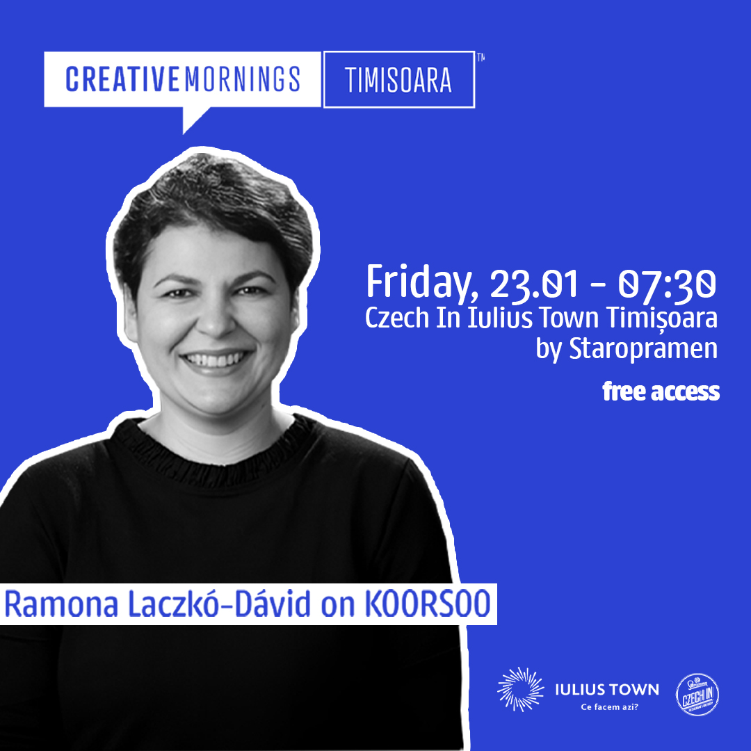 Vineri, la Iulius Town va avea loc una dintre întâlnirile Creative Mornings, un eveniment dedicat comunității locale, în cadrul căruia participanți din industriile creative, educație, antreprenoriat, cultură și alte domenii se întâlnesc pentru schimb de idei și inspirație. Ediția din ianuarie va avea loc la Czech In Iulius Town by Staropramen, iar invitata specială este Ramona Laczkó-Dávid, profesionist cu peste zece ani de experiență în sectorul cultural din Europa și Asia.