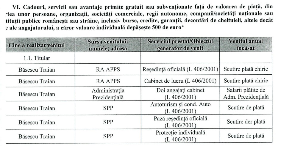 În plus, fostul președinte rămâne fără următoarea categorie de beneficii din declarația de avere: