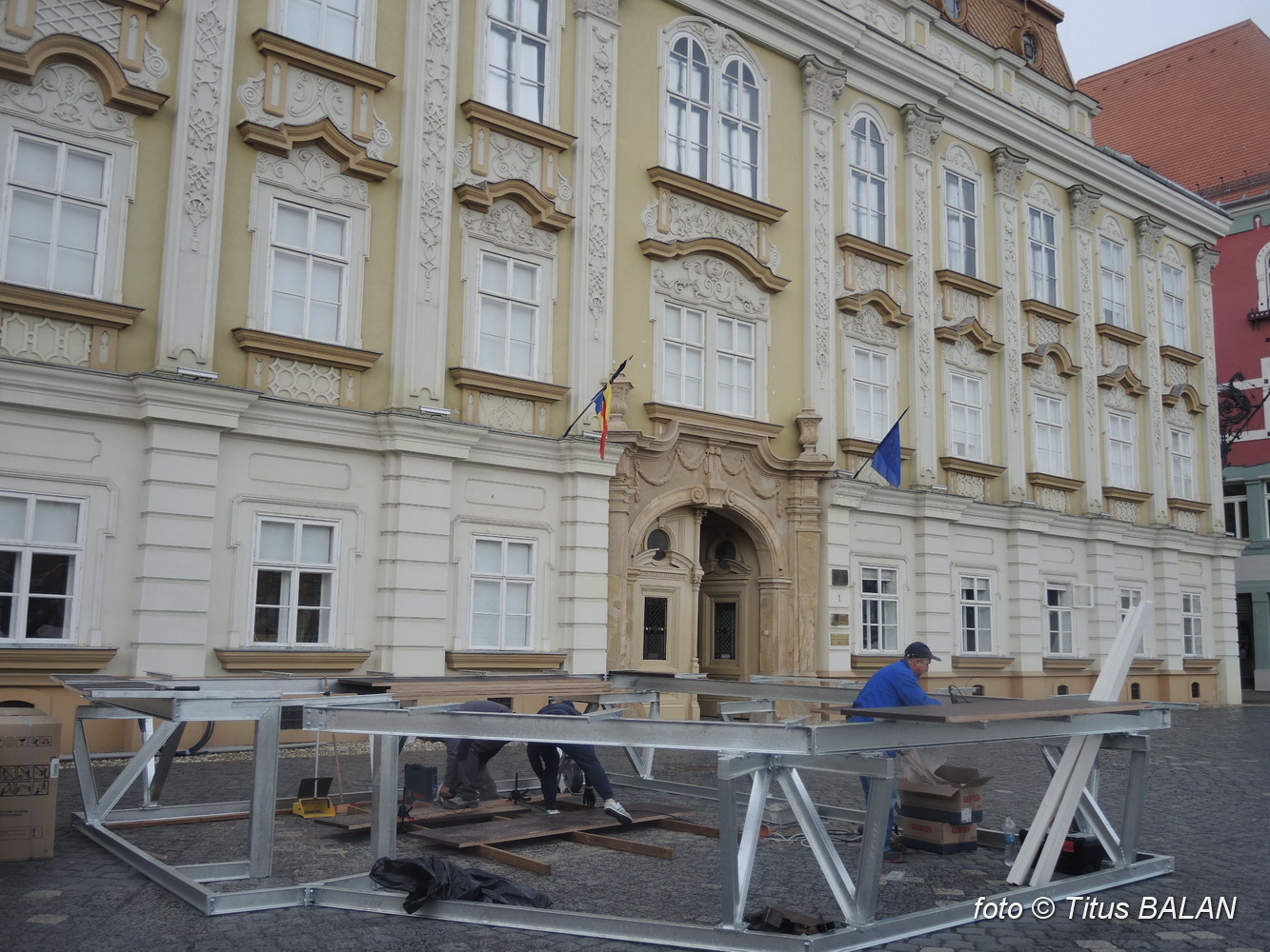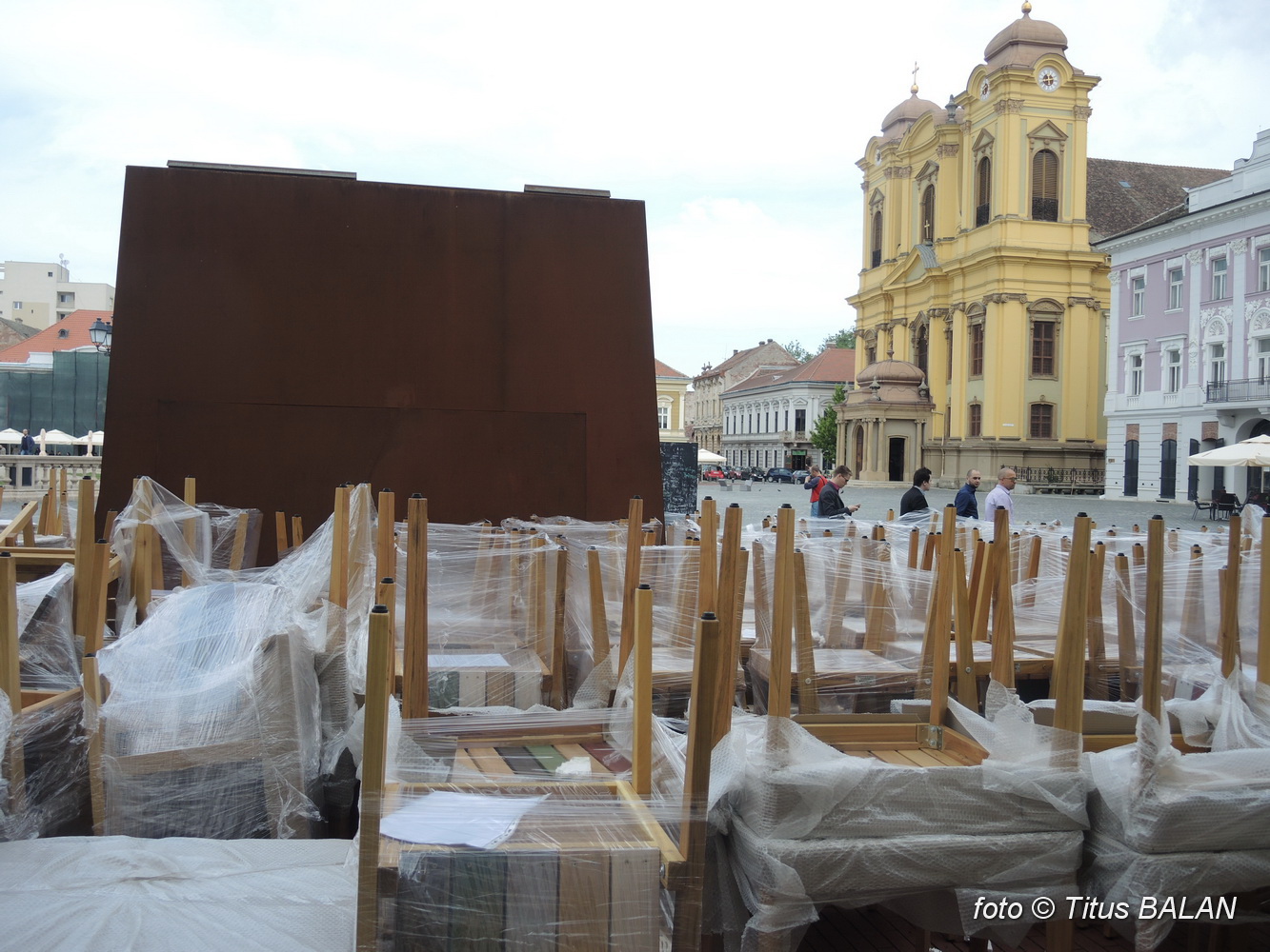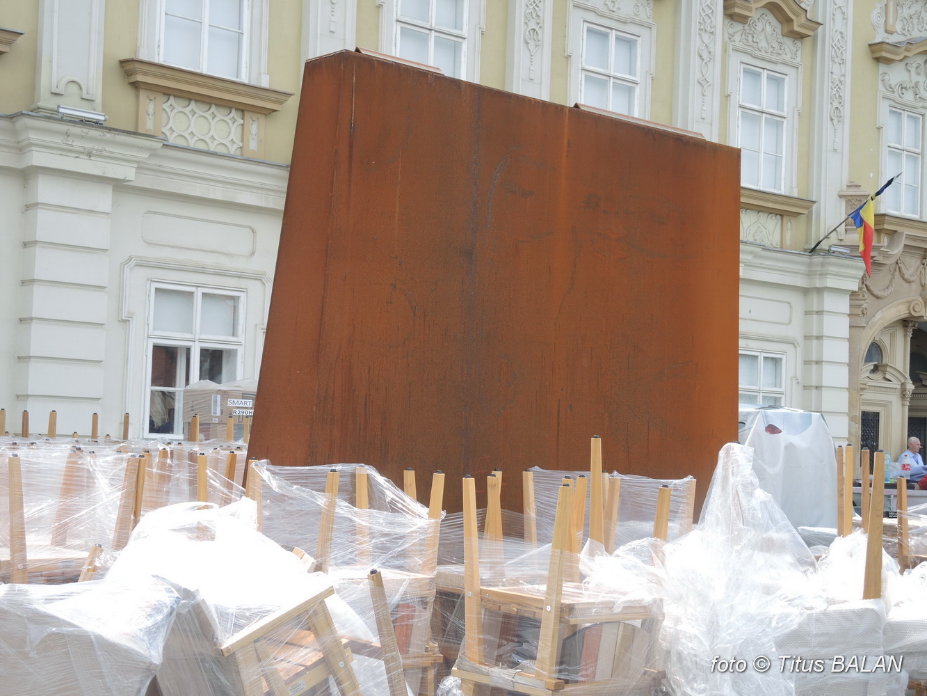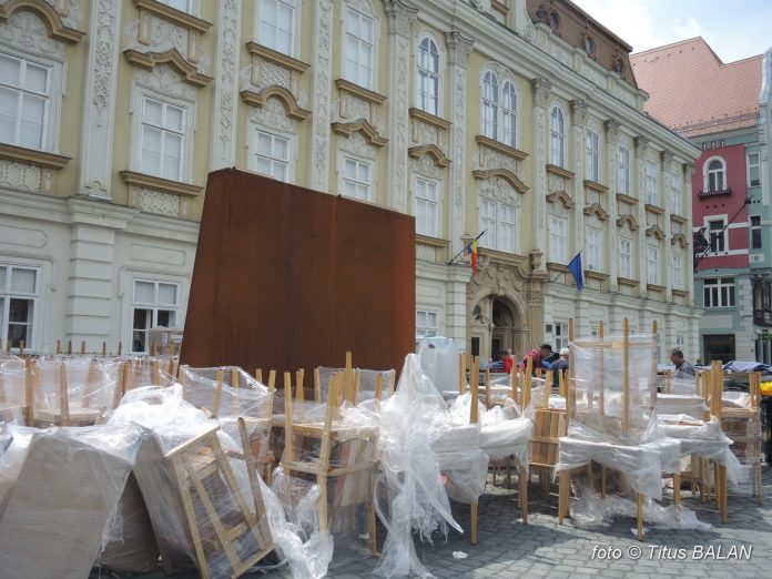 De câteva luni a apărut în dreptul fațadei principale o… măgăoaie. Mare, paralelipipedică din tablă ruginită. Tablă ce este cu înverșunare prezentată de autorități și de arhitecți drept un material nobil. Poate că timișorenii nu știu sa aprecieze la adevarata valoare noblețea fierotaniei.