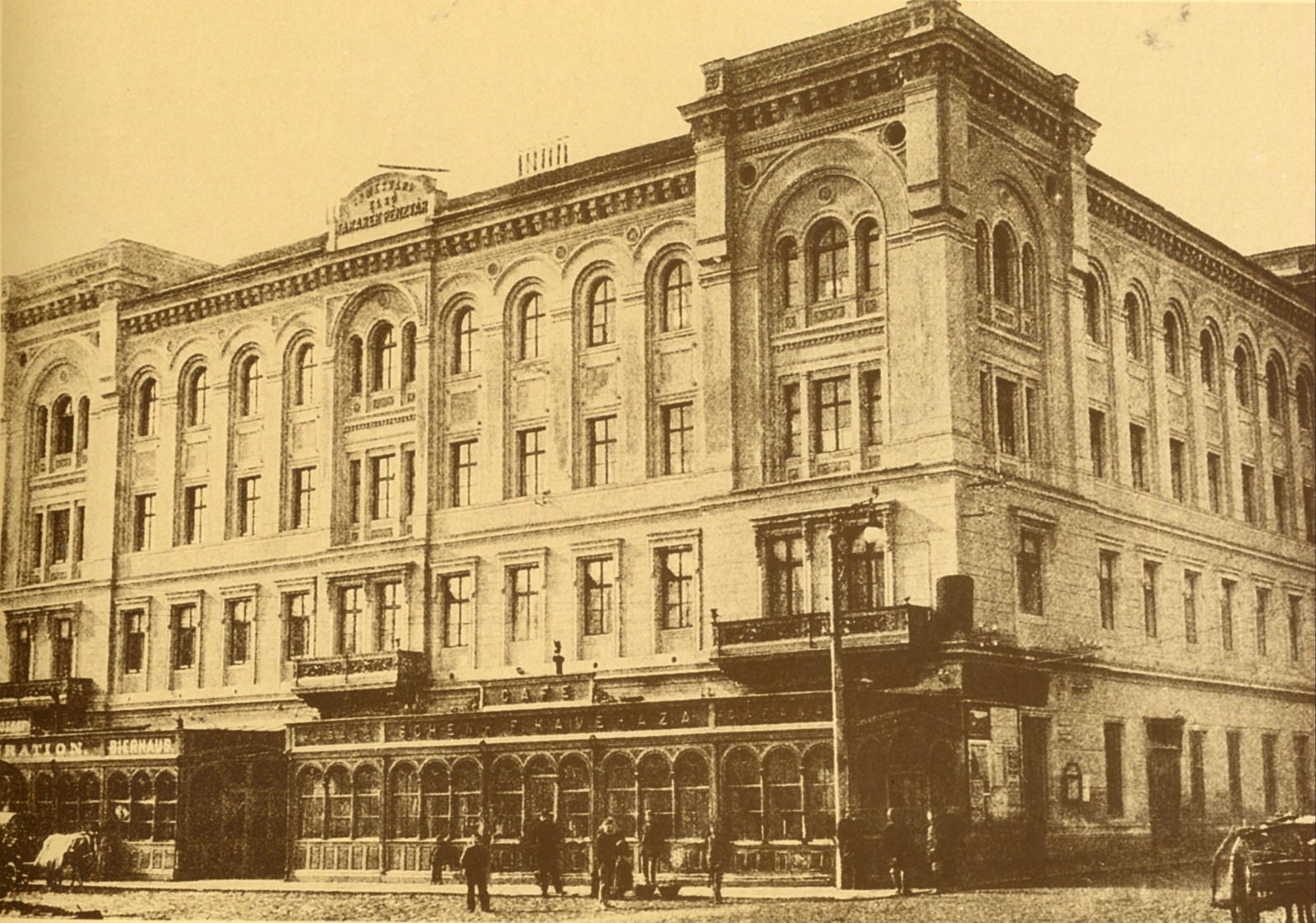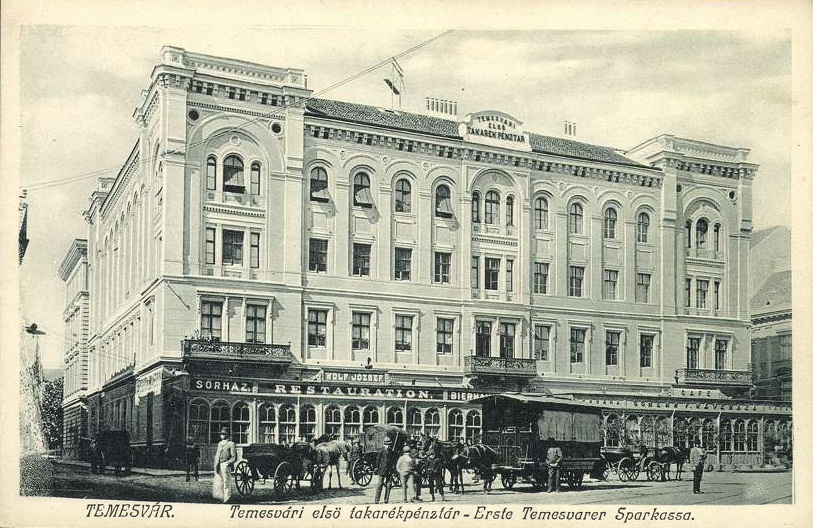 Primele instituţii de credit din Timişoara au apărut la sfârşitul secolului al XVIII-lea. În secolul următor, numărul lor a crescut semnificativ. Printre primele insitituţii se numără Prima Casă de Economii din Timişoara. Vremea a trecut, şi burghezia timişoreană, mult timp sufocată de administraţia militară, a început să capete consistenţă şi putere finaciară. Spre jumătatea secolului al XIX-lea, acumulările de capital ale unor familii timişorene au favorizat apariţia mai multor bănci, instituții de creditare sau de păstrare. Pe latura de vest a pieţei s-a construit, începând cu 1847, un sediu nou pentru , adică pentru Prima Bancă de Păstrare Timişoreană, sau Temesvári Első Takarékpénztá. Bazele au fost puse deja în anul 1845, dar nu exista propriu-zis un sediu unde să se lucreze cu banii. Pe latura de vest a pieţei s-a construit, începând cu 1847, sediul nou pentru Erste Temeswarer Sparkassa, la 1849, iar în timpul asediului revoluţionarilor maghiari, construcţia, neterminată, s-a prăbuşit parțial, provocând două victime. Au murit la datorie doi lucrători de pe șantier. După liniștirea lucrurilor, odată cu înăbușirea Revoluției, s-au reluat și lucrările la edificiul bancar, care a fost finalizat în 1855.