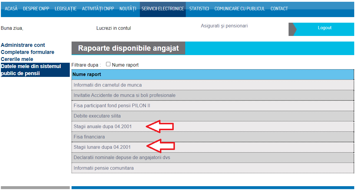 3. În acea secțiune, poți alege fie un document cu stagiile lunare de cotizare înregistrate în evidențele CNPP începând cu aprilie 2001, fie un document cu stagiile anuale de cotizare. Intri pe stagii lunare sau pe stagii anuale și apoi apeși pe „Generează raport actualizat”.