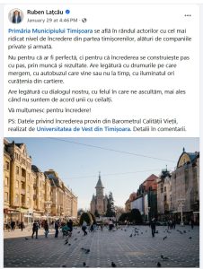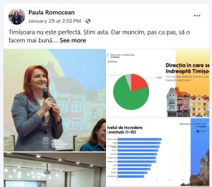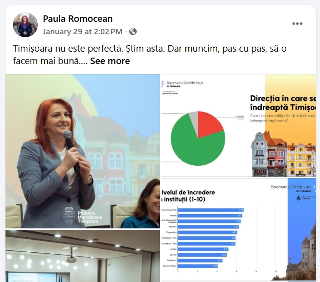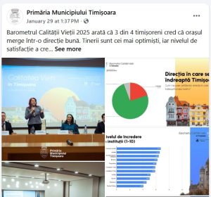 În postările Primăriei Timișoara, ale viceprimarilor Ruben Lațcău și Paula Romocean, procentul se transformă în limbaj de lemn: „încredere”, „confirmare”, „rezultat al muncii”.