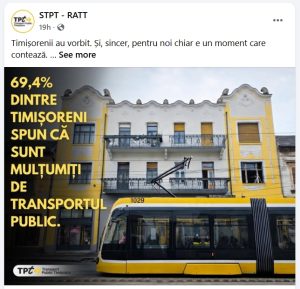 STPT își construiește întregul mesaj în jurul unei singure cifre: „69,4% dintre respondenți sunt mulțumiți de transportul public.”