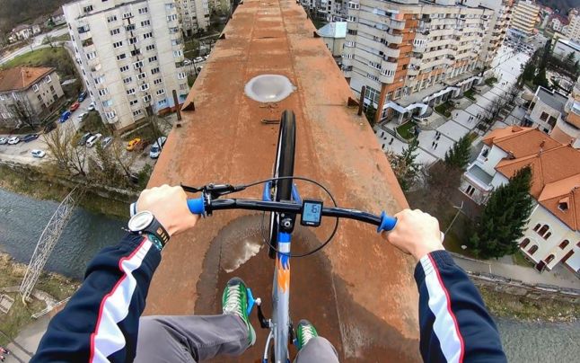 Nebunie sau curaj? Cărășanul Flaviu Cernescu a stârnit din nou senzație după ce a publicat un video în care poate fi urmărit cum se plimbă și chiar face slalom cu bicicleta la zeci de metri deasupra Reșiței, chiar pe celebrul funicular care traversează zona centrală.