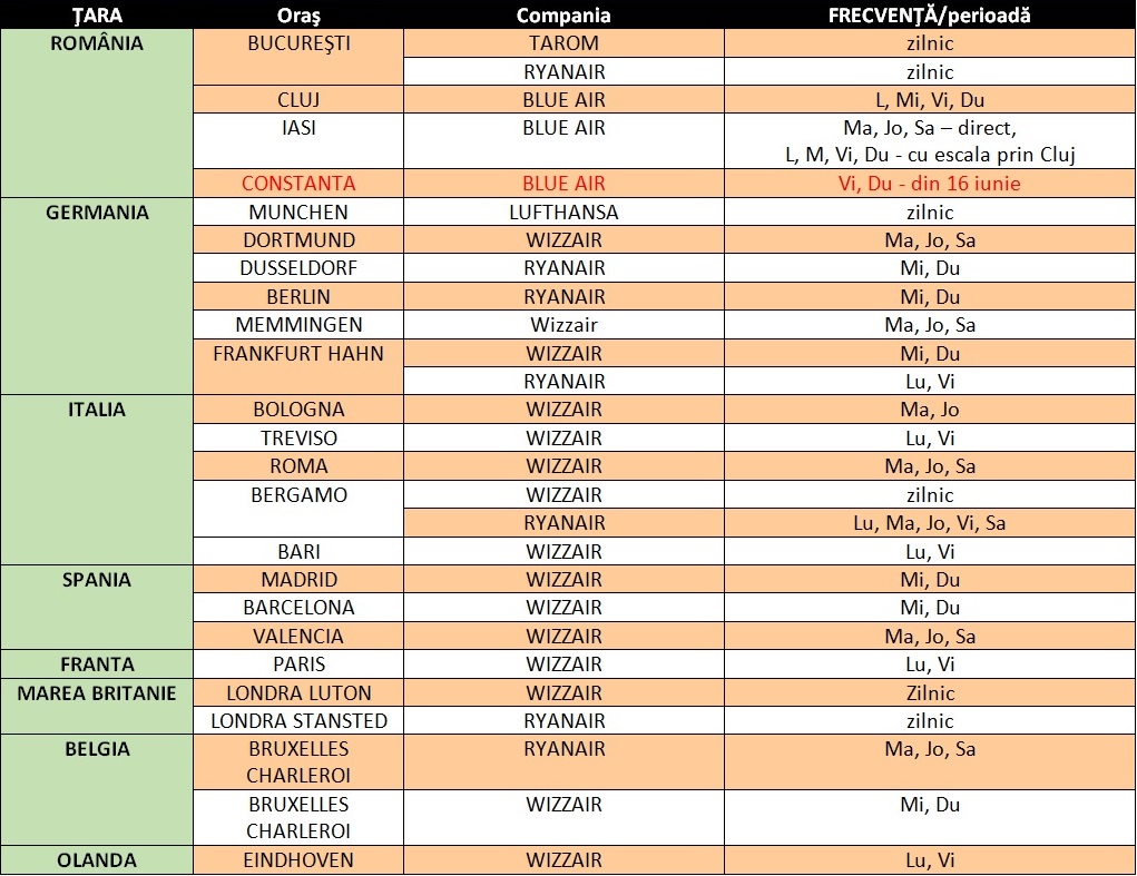 Timp de o săptămână – în perioada sărbătorilor Pascale şi apoi permanent, din luna iunie, va creşte frecvenţa săptămânală a zborurilor spre şi dinspre: Dortmund (de la 2 la 3 zboruri pe săptămână) şi Valencia (de la 2 la 3 zboruri pe săptămână). Pe de altă parte, va fi redus numărul de zboruri spre Bucureşti, de la 39 de curse pe săptămână, la 31.