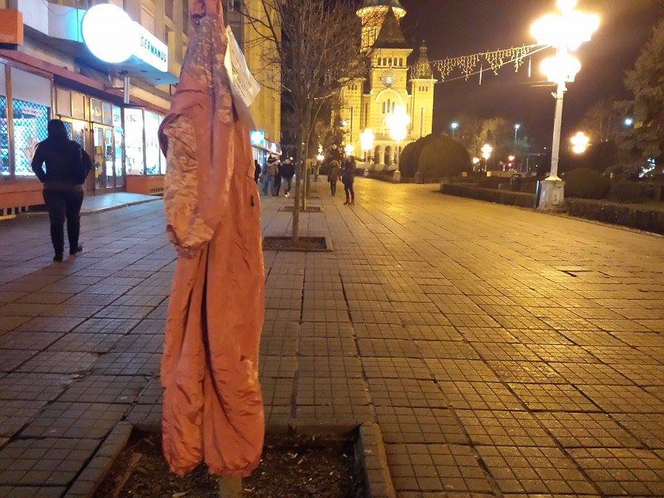 „Dacă ai nevoie, e pentru tine! Sper ca această haină să-ţi ţină de cald atunci când ţi-e frig, să-ţi amintească că nu eşti singur atunci când te simţi părăsit, să-ţi încălzească inima cu iubire atunci când te simţi pustiit, să-ţi dea forţa să te ridici atunci când eşti la pământ, să te ajute să depăşeşti încrezător toate clipele grele, ca să poţi merge demn mai departe. Îţi mulţumesc că ai acceptat acest cadou şi toate gândurile mele bune”, scria pe unul din bileţelele prinse de o haină groasă în centrul Timişoarei.