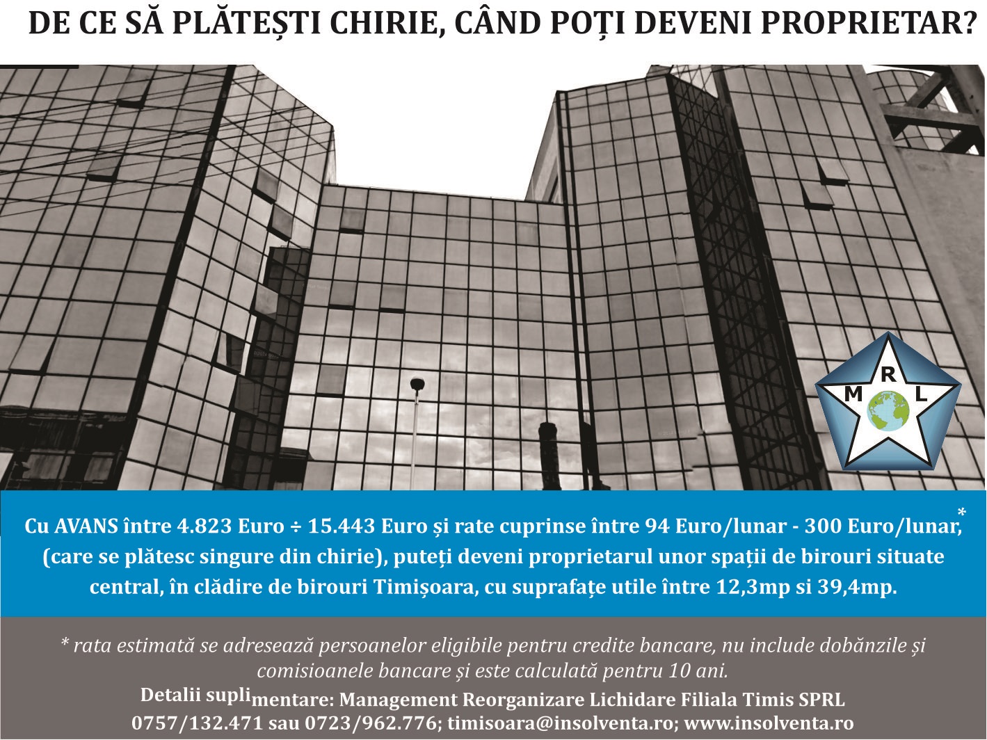Cu AVANS între 4.823 Euro ÷ 15.443 Euro și rate cuprinse între 94 Euro/lunar* – 300 Euro/lunar*, (care se plătesc singure din chirie), puteți deveni proprietarul unor spații de birouri situate central, în clădire de birouri Timișoara, cu suprafațe utile între 12,3mp si 39,4mp.