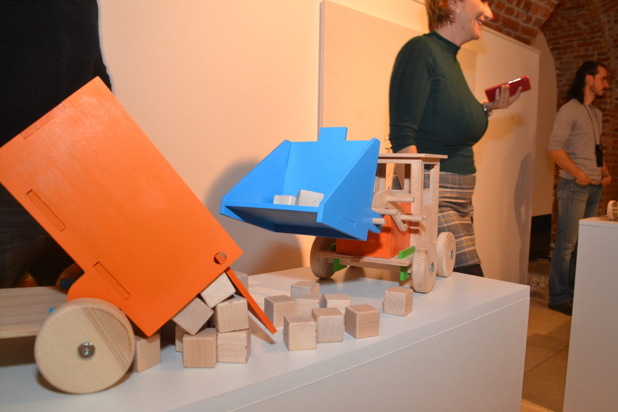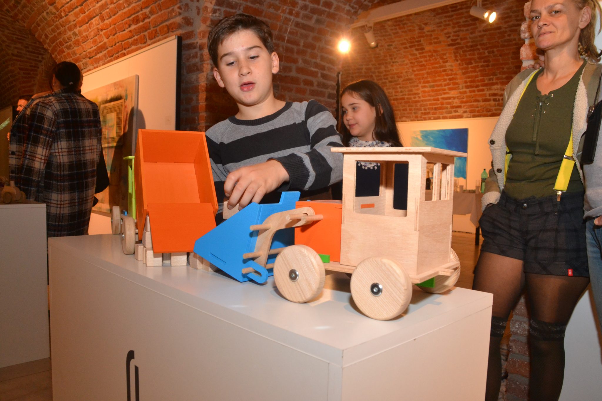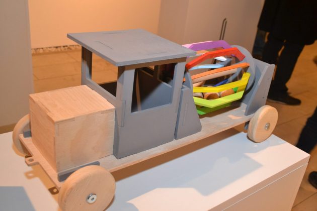 Mașinute, trenulețe, camioane goale sau încărcate cu marfă, betoniere pline cu bile de lemn, toate au luat loc pe rafturile expoziției de la galeria Calpe din Bastion. Oare cine poate rezista să nu încerce un trenulet de lemn? Cele mai multe sunt în culoarea naturală a lemnului. Dar și culorile au rolul lor pentru a atrage privirea.