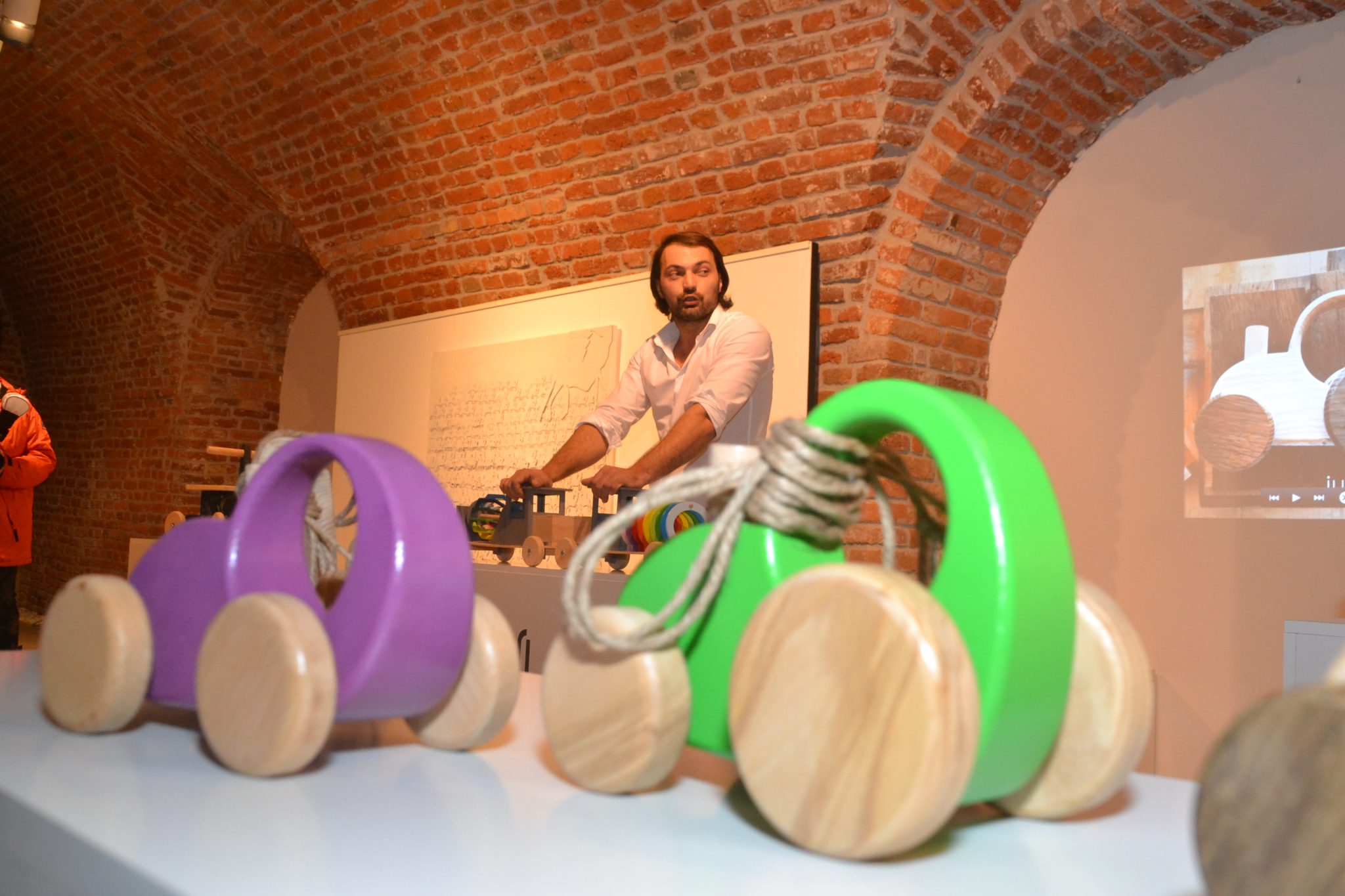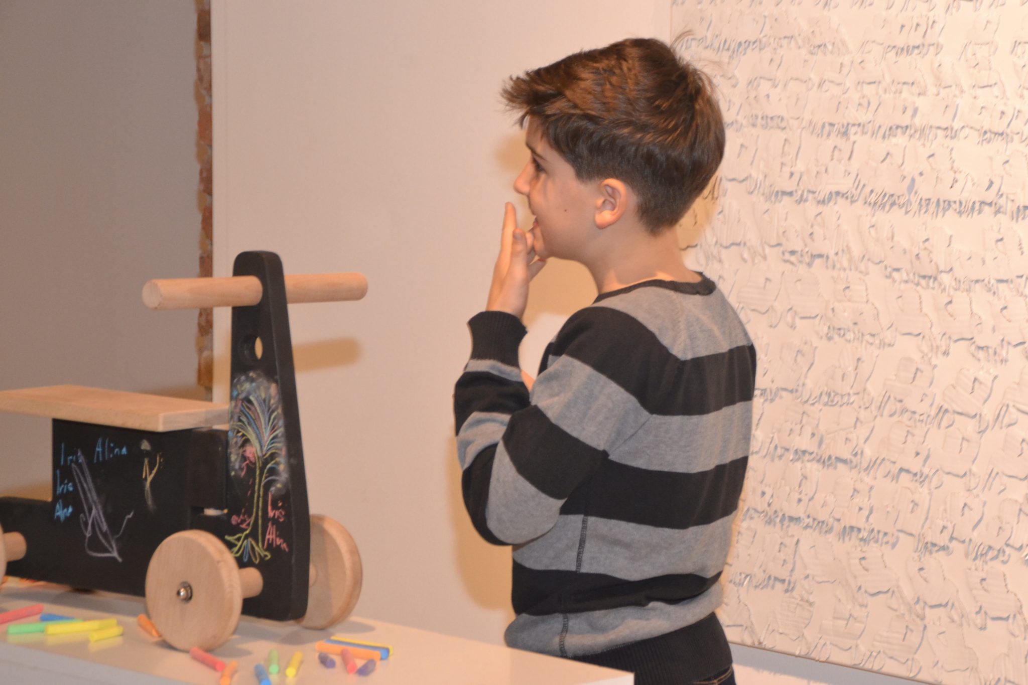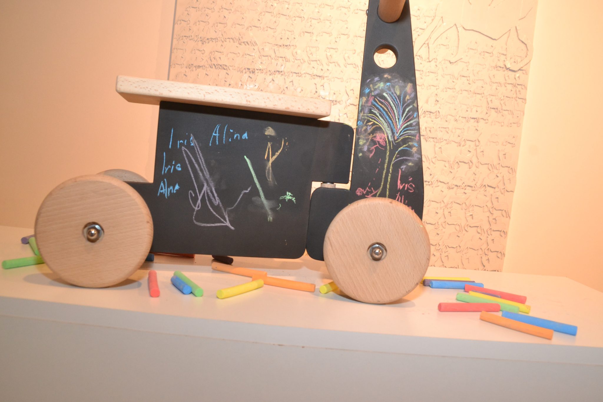Imaginația designerului devenit tâmplar nu are limite. O tricicletă din lemn are culoarea neagră a tablelor de școală tocmai pentru copii ce vor să scrie sau să deseneze cu cretă colorată pe vehiculul lor. O fetiță la fel de creativă ca artistul a și pus imediat mâna pe cretă și a colorat tricicleta. Dar dacă ar putea alege și-ar dori o maimuțică de lemn.