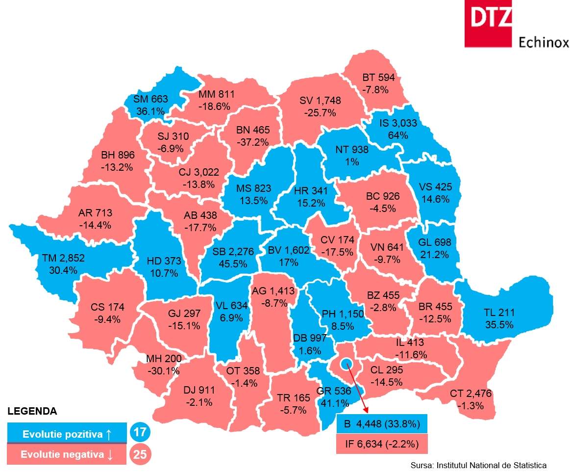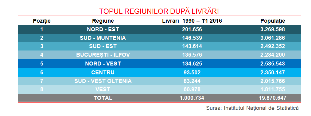 Potrivit unei analize realizate de DTZ Echinox, pe baza datelor Institutului Naţional de Statistică, numărul locuinţelor construite în România după 1990 a depăşit pragul de un milion. Cele mai multe (peste 200.000 de case şi apartamente) au fost construite în Regiunea de Nord-Est, iar cele mai puţine (puţin peste 50.000) în Regiunea Vest.