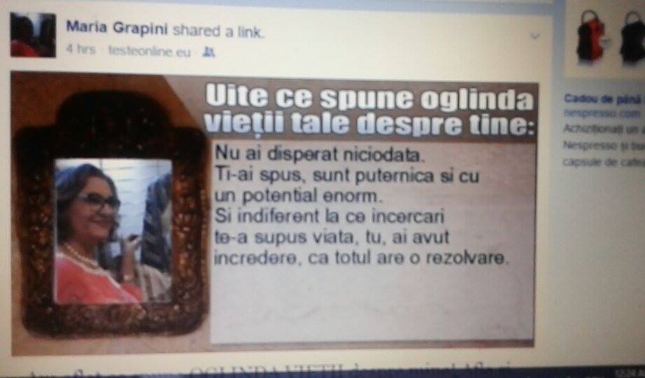 Maria Grapini a distribuit pe pagina ei de Facebook o aplicaţie intitulată „Uite ce spune oglinda vieţii tale despre tine”, care face o caracterizare a distinsei europarlamentare: „Nu ai disperat niciodata. Ti-ai spus, sunt puternica si cu un potential enorm. Si indiferent la ce incercari te-a supus viata, tu, ai avut incredere, ca totul are o rezolvare.”